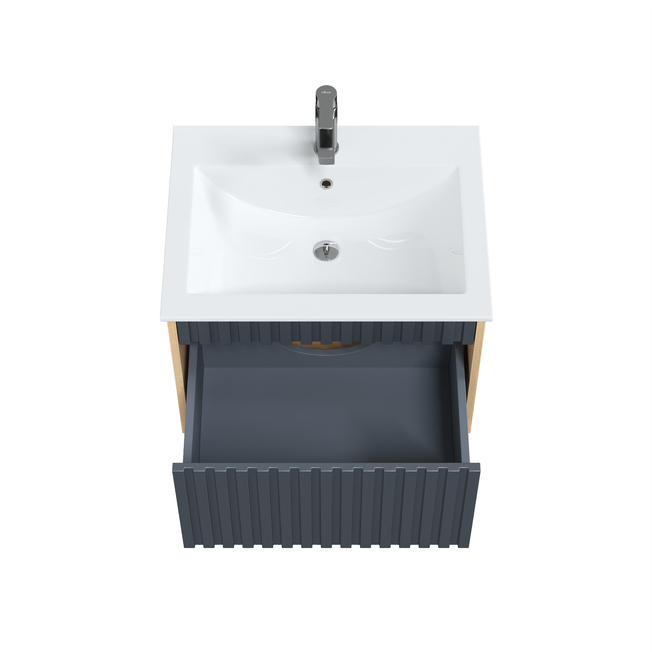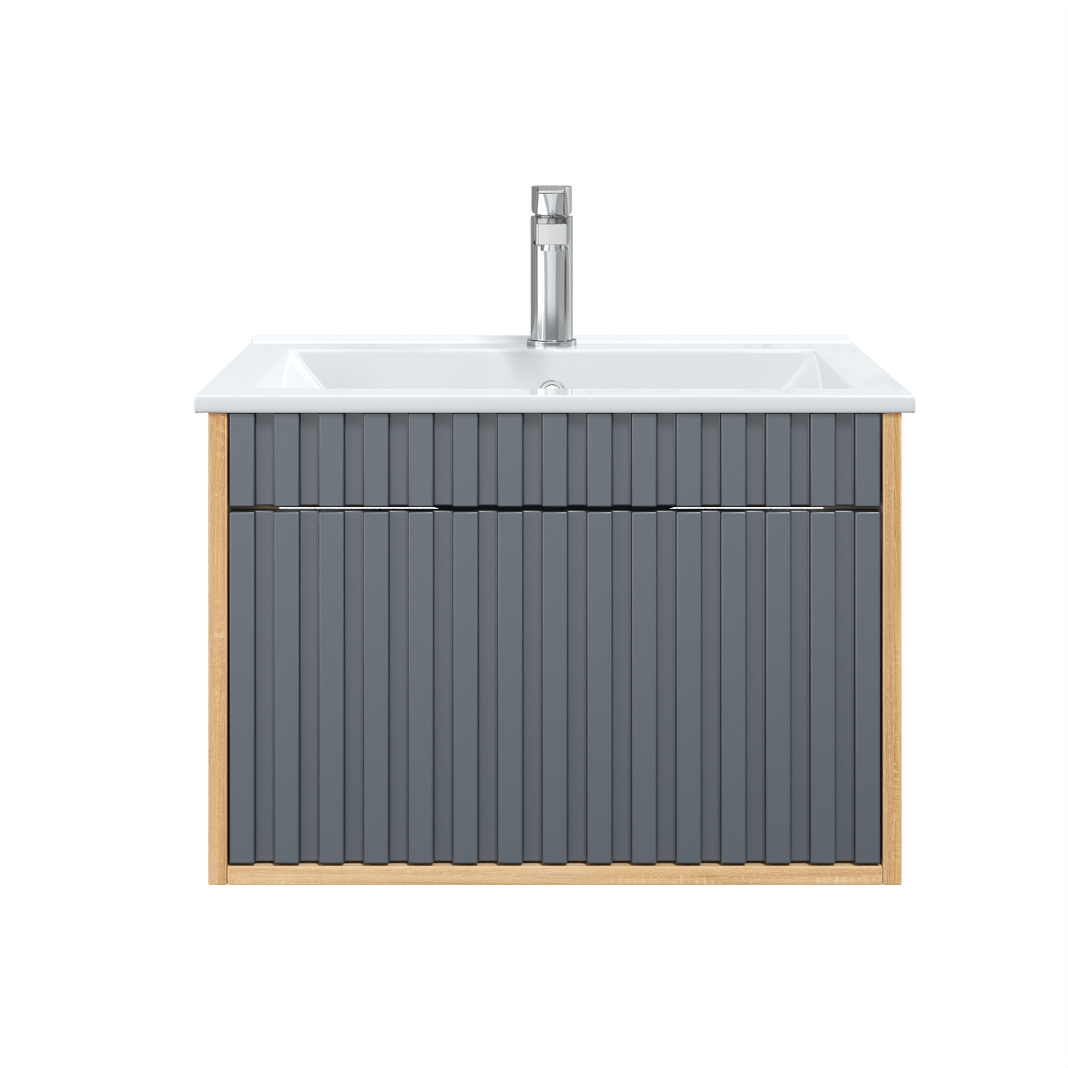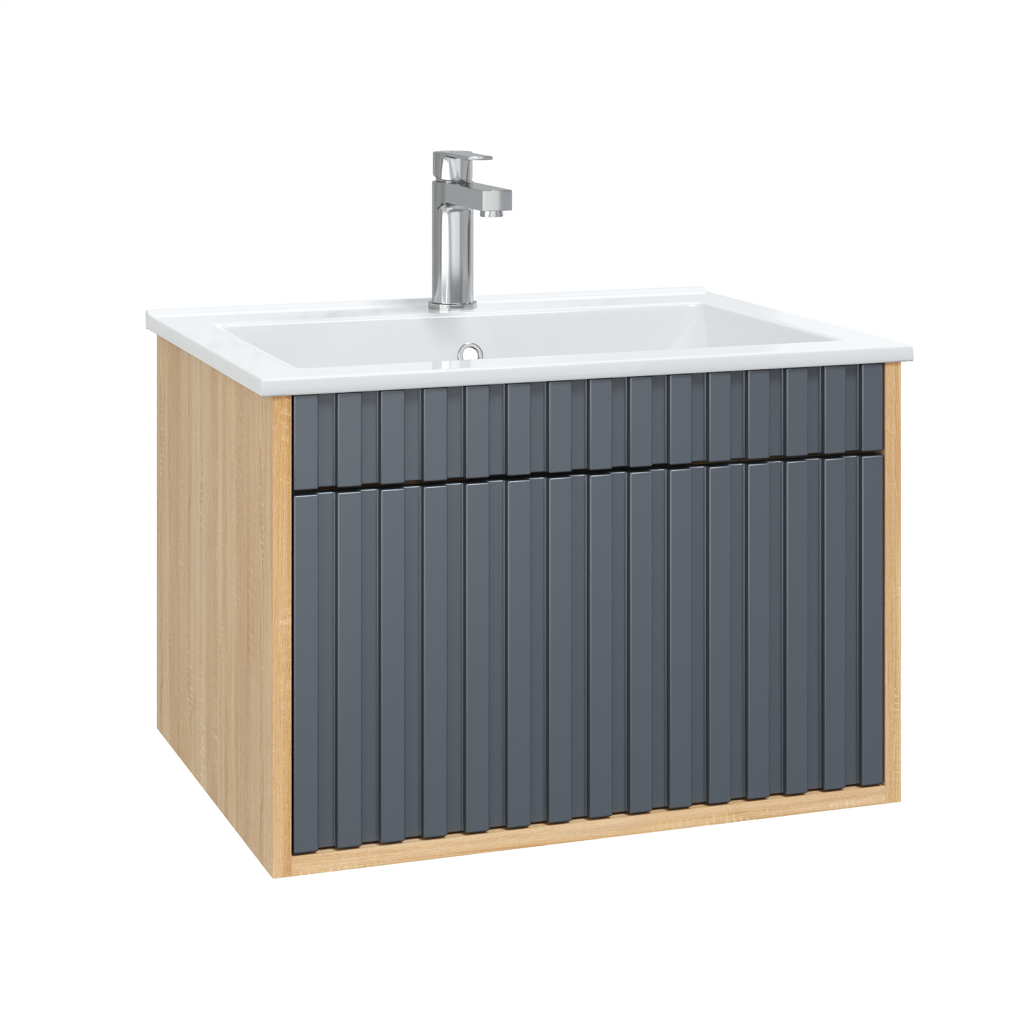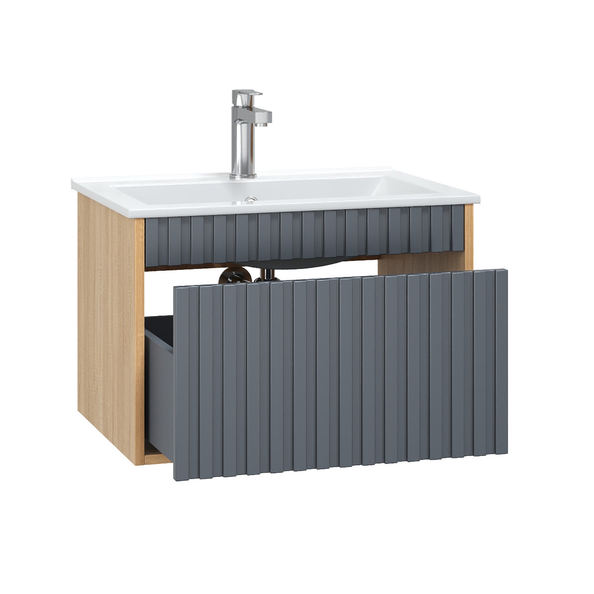 Рифленый серый матовый фасад с покрытием SoftTouch и корпус цвета дуба с роскошной текстурой подчеркнет изысканный вкус владельца и станет центральным элементом декора.