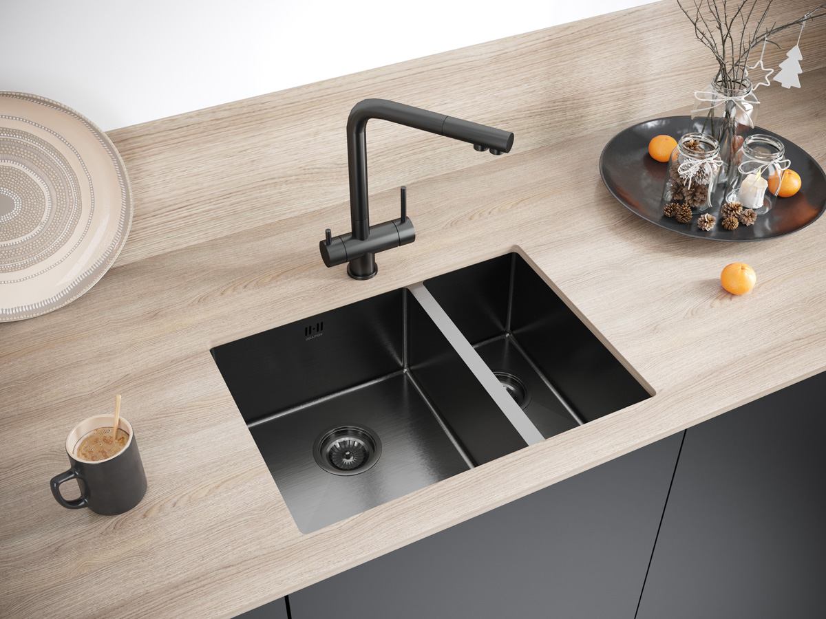 Габариты мойки составляют 590х440 мм, а дополнительная чаша шириной 180 мм расширяет функционал. Возможен подстольный, накладной монтаж или монтаж вровень со столешницей.