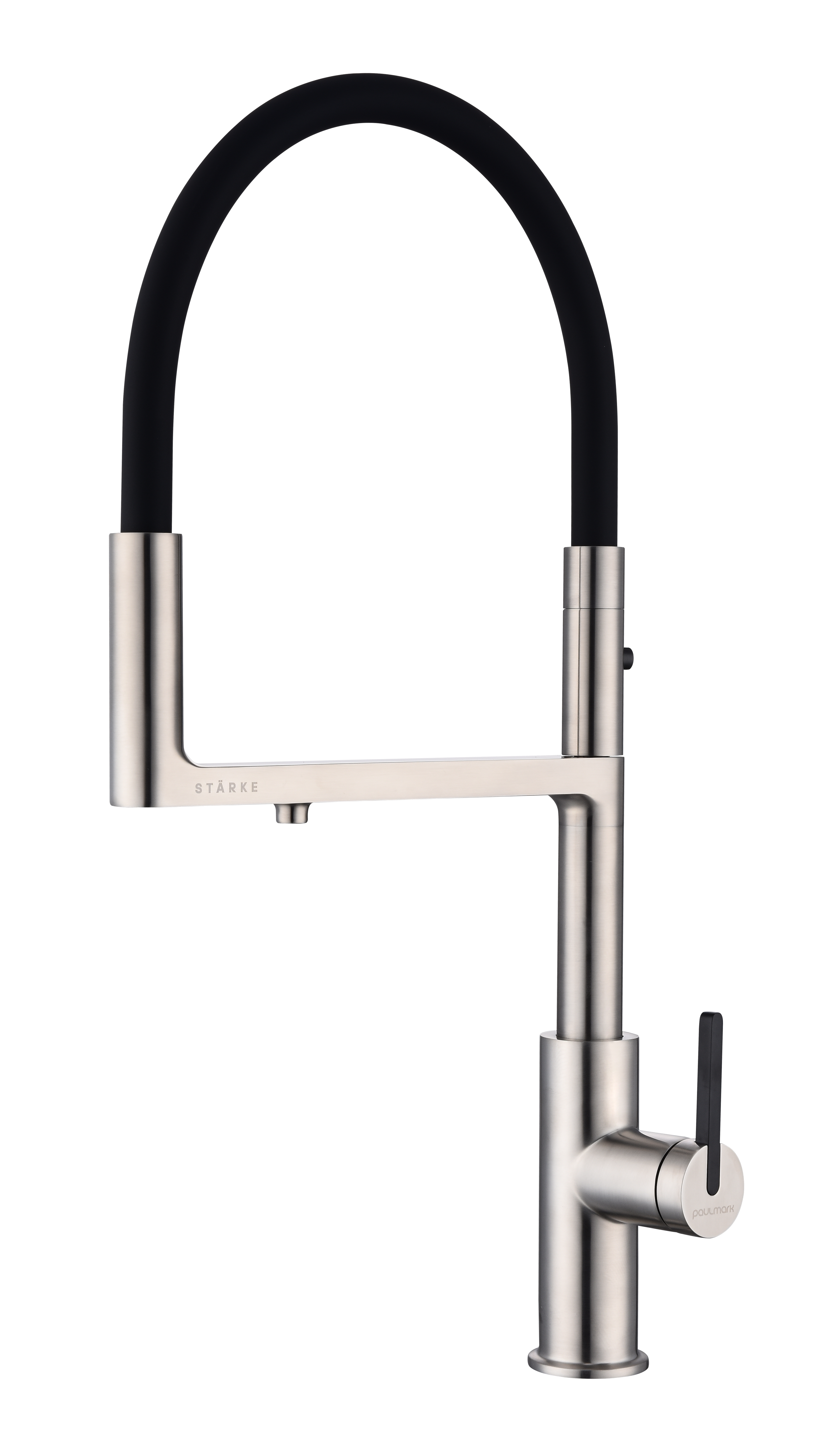 Гибкий силиконовый излив оснащен функцией деликатного душа и магнитным механизмом фиксации в задней части латунного корпуса. Он позволяет ополоснуть посуду или мойку в любой ее части или наполнить емкости даже на столе рядом с мойкой.