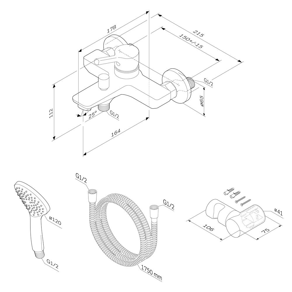 В комплекте душевой набор: стильный ручной душ 120 мм 1 режим настенный держатель с регулировкой угла наклона душевой шланг с защитой от скручивания.