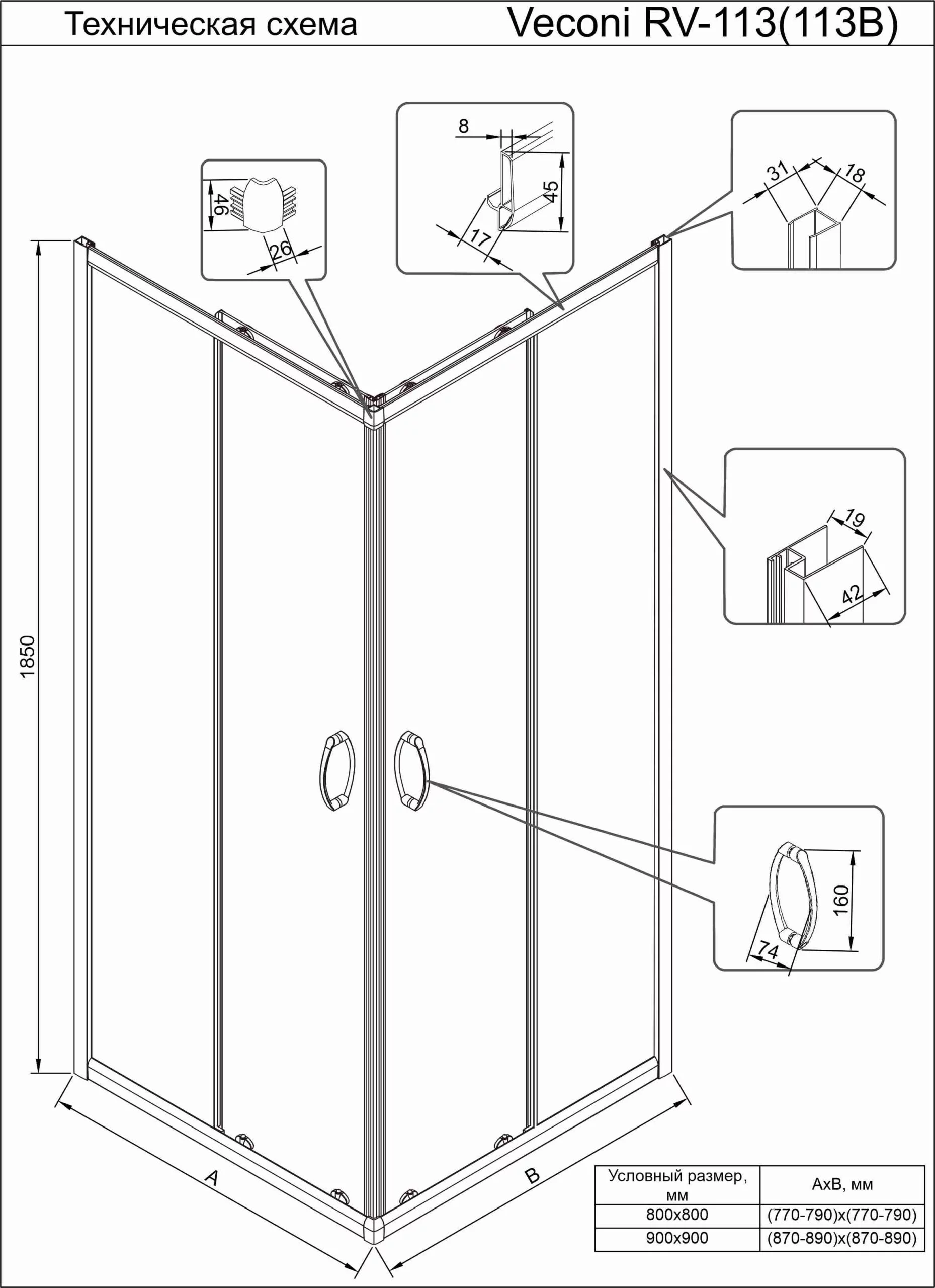 —Душевой уголок Veconi Rovigo RV113B-80-01-C4 80х80 стекло прозрачное профиль черный без поддона