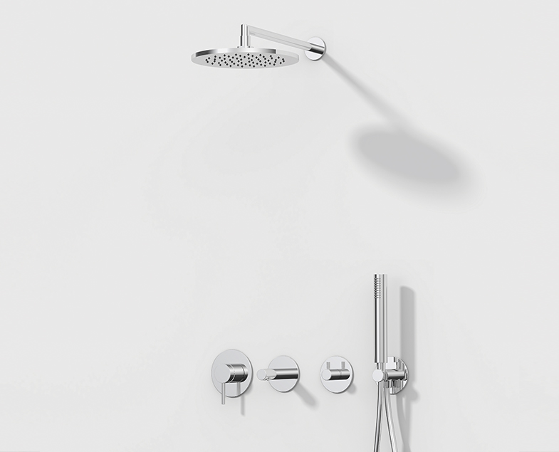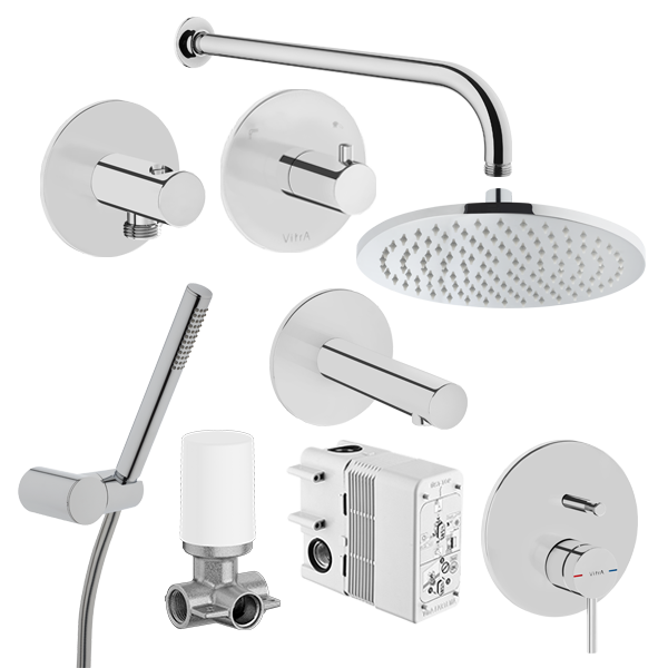 <p>ручной душ, <br />верхняя лейка с кронштейном, <br />излив, <br />смеситель, <br />переключатель и внутрення часть для встроенных душевых систем</p>