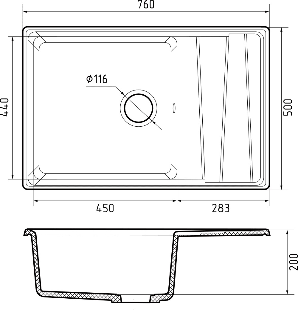 Кухонная мойка врезная из искусственного мрамора, прямоугольной формы, отверстие под смеситель отсутствует, размер чаши составляет 450*440*200, диаметр сливного отверстия составляет 8.89 см. В комплектацию входит: мойка, сливная арматура, паспорт.