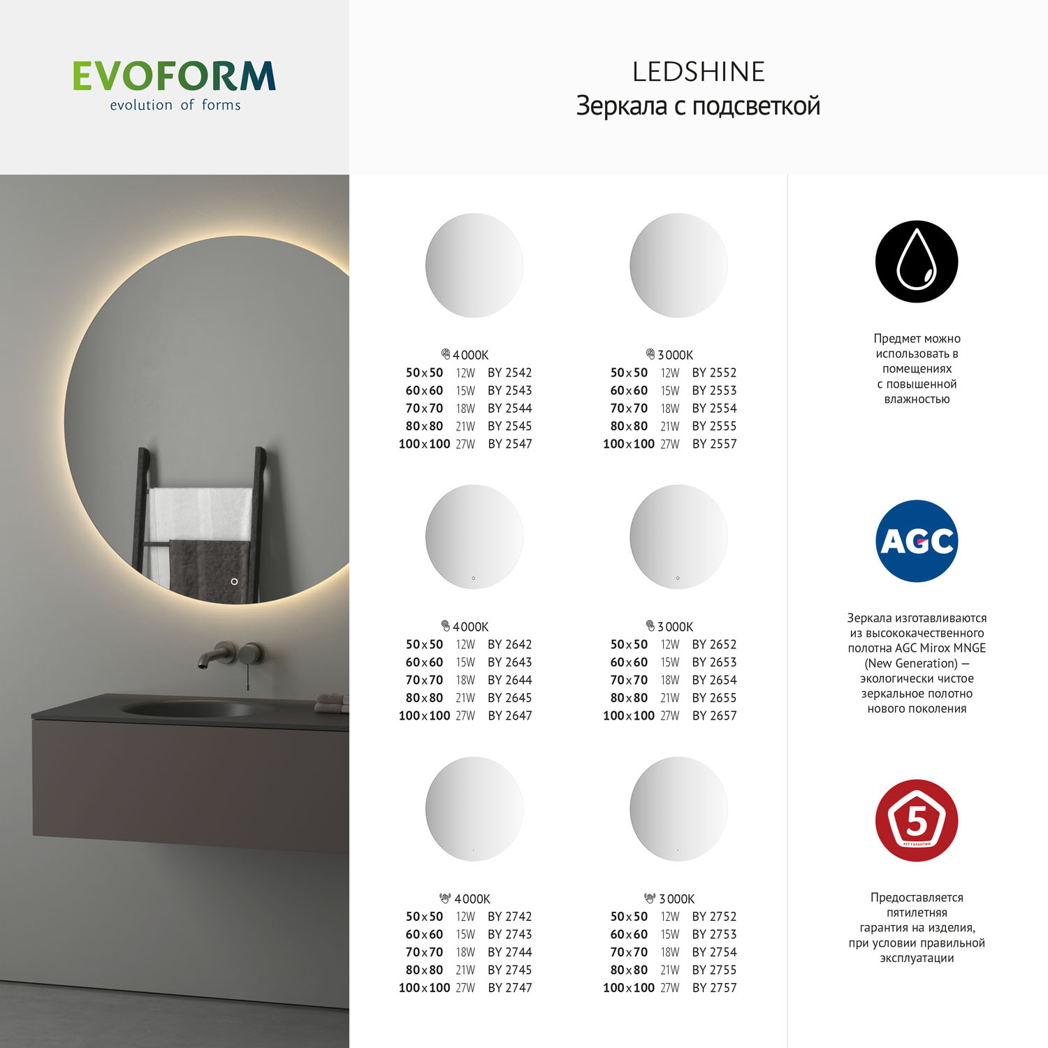 Компания ООО «САНТЕХ АЛЬЯНС» при изготовлении зеркал торговой марки «Evoform» использует серебряные зеркальные полотна мирового производителя AGC- Asahi Glass Co (Япония). AGC - первая компания, применившая новейшую технологию Mirox, которая стала мировым эталоном. Mirox New Generation Ecological - это новое поколение экологически чистых, высококачественных, стойких к воздействиям зеркал, характеристики которых превосходят требования самых строгих стандартов. ПРЕИМУЩЕСТВА: Высокие антикоррозионные свойства; Способность готового продукта противостоять химическим повреждениям; Срок полезного использования в 3 раза превышает аналогичный показатель традиционных зеркал; Повышенная стойкость к абразивным средствам очистки: в семь раз выше, чем у традиционных зеркал; Отсутствие точечной коррозии и «цветения» с течением времени; Сертификация Cradle to Cradle - безотходная система производства; Испарение летучих органических соединений и формальдегида сведено к минимуму; Устойчивы к высоким температурам при равномерном нагревании (до 80°C).  Компания располагает современным оборудованием, владеет новейшими технологиями и имеет в штате квалифицированный персонал. Высоких стандартов качества продукции предприятию удается достигнуть благодаря использованию специализированного оборудования ведущих европейских производителей и высококачественного экологически безопасного зеркального полотна. Широкий модельный ряд позволяет максимально удовлетворить самые разнообразные пожелания покупателей. ООО «САНТЕХ АЛЬЯНС» уже много лет производит и реализует зеркала для ванной комнаты, зеркала изготавливаются с соблюдением всех необходимых условий производства. По праву можно назвать наш ассортимент одним из самых больших среди европейских производителей, работающих со складским остатком.