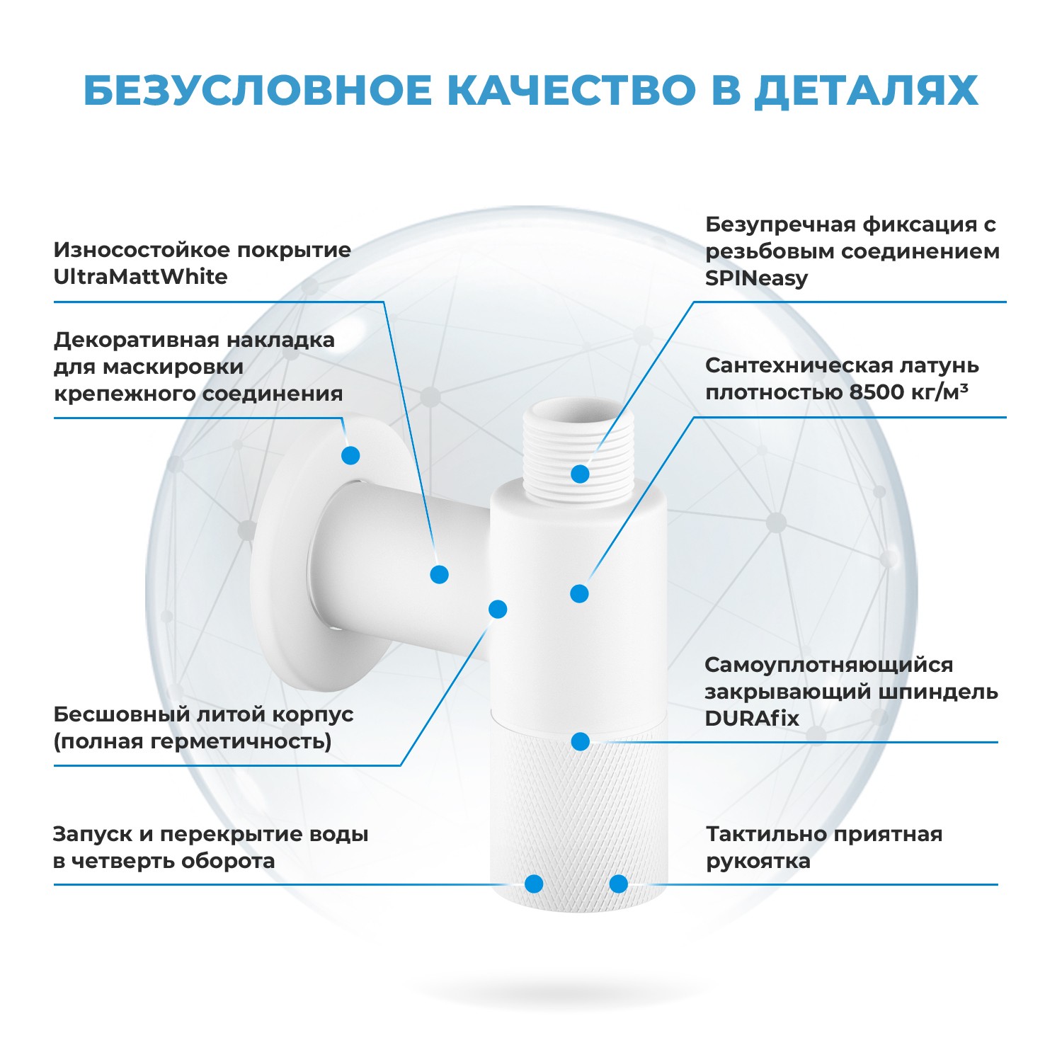 Угловые вентили выполнены из высококачественной сантехнической латуни. Не подвержены изнашиванию, коррозии, устойчивы к температурным нагрузкам. Специальное покрытие UltraMattWhite не только сохранит насыщенность цвета и блеск на протяжении долгого срока службы, но и обеспечит легкий уход благодаря грязеотталкивающим свойствам.