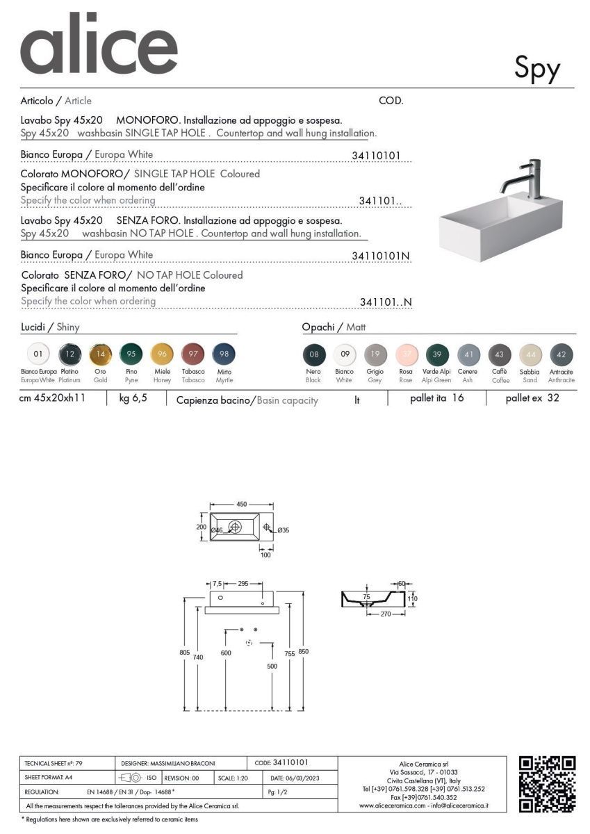 —Раковина керамическая Alice Spy 34110101 50х20 подвесная цвет белый