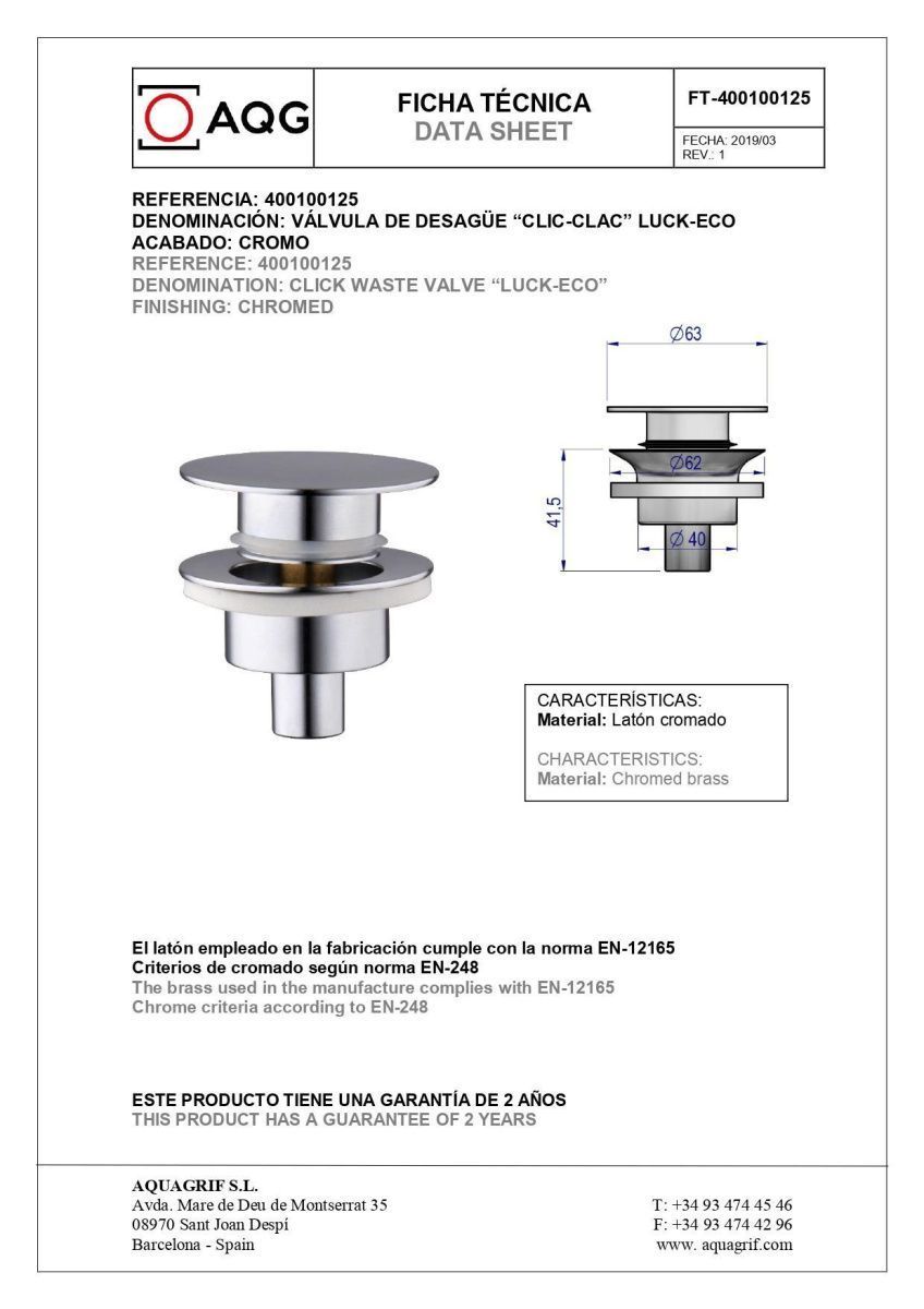 Донный клапан AQG Донные клапаны 400100125 хром