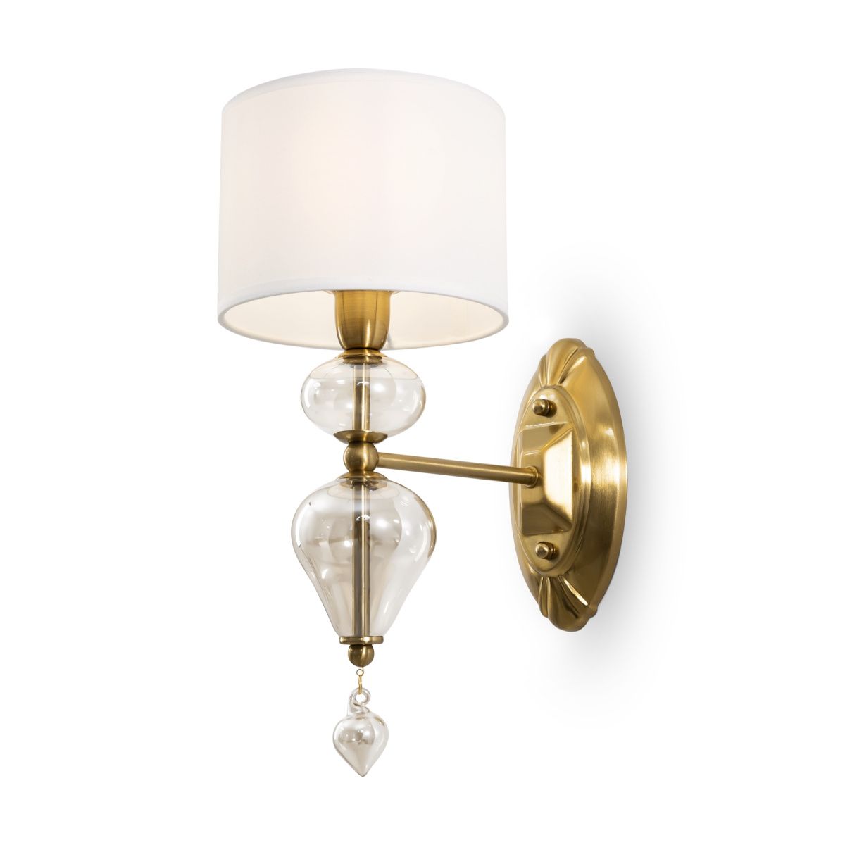 Арматура из металла, цвет — латунь. Плафоны — тканевые, молочного цвета. Металлическая конструкция декорирована выдувными стеклянными элементами с перламутровым напылением. Источником света служит лампа с цоколем Е14.