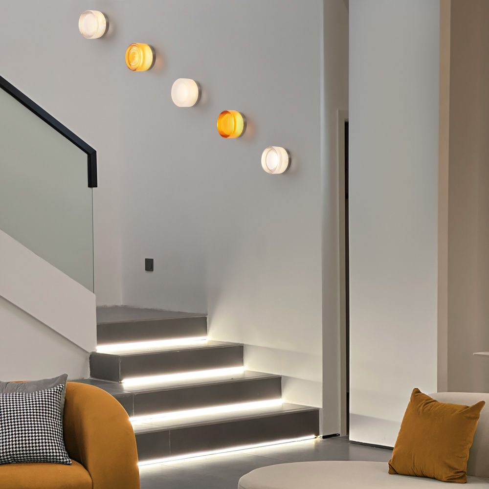 Металлическая арматура в цвете никель в трех  рельефных основаниях. Плафоны, выполненные в приглушенно пшеничном и янтарном оттенках, доступны в двух размерах. LED источник света 2400К/2550К/3000K.
