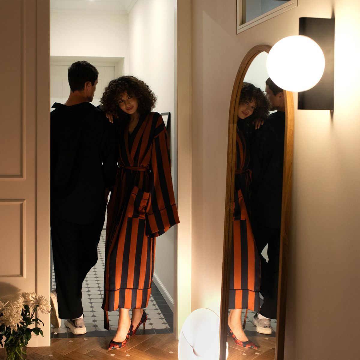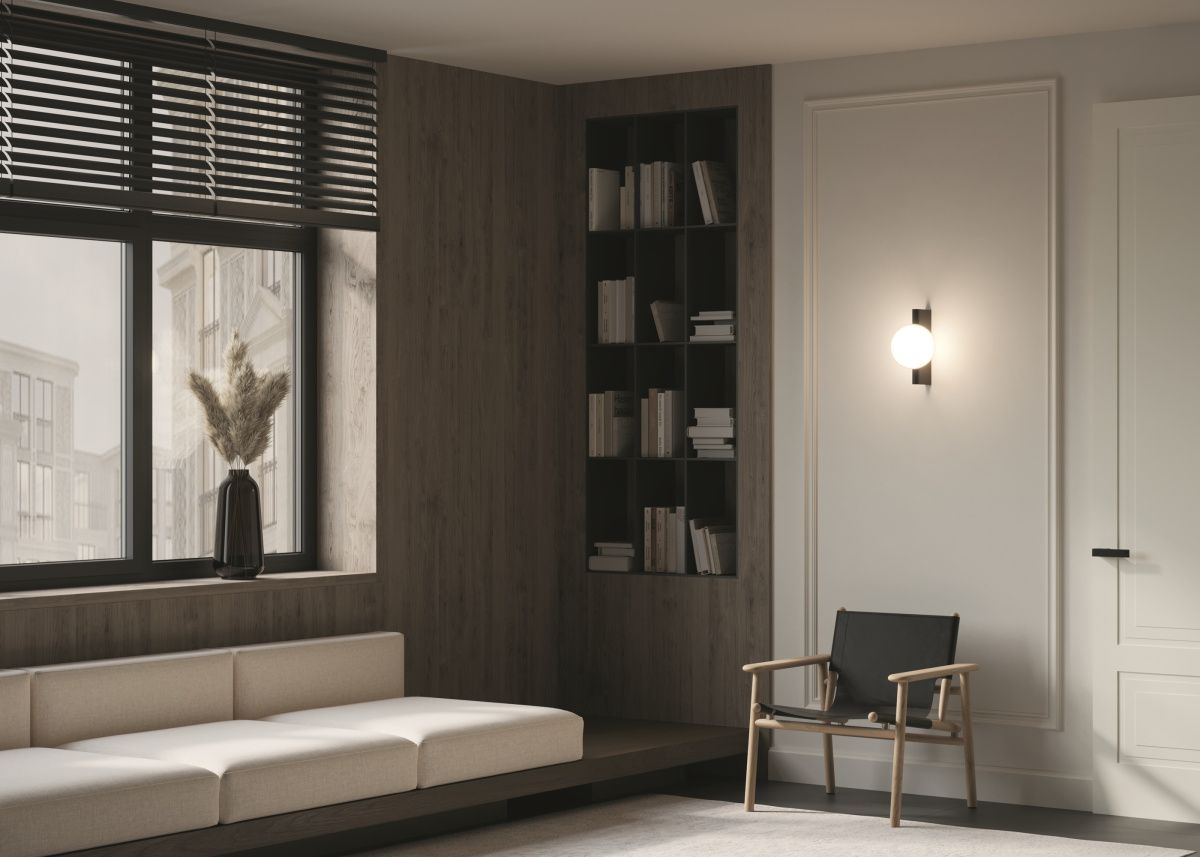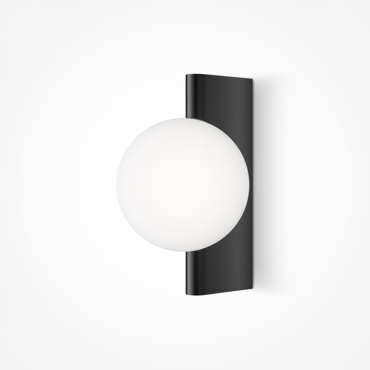 Арматура из металла, оттенки – матовый черный, латунь, хром. Плафон-сфера – стекло, цвет – белый. Скрытое крепление. Оригинальная геометрия в дизайне. Чистый теневой рисунок