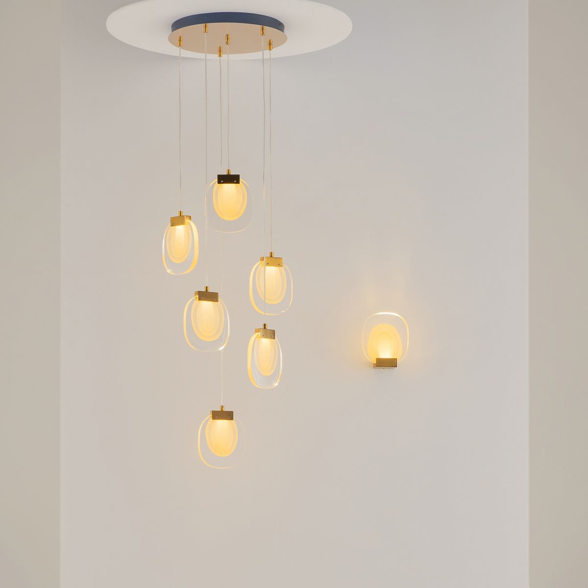 Арматура - металл, цвет - белый, черный. Плафоны окрашены в дымчатый или белый полупрозрачные цвета.  В плафон установлен LED-источник света с мощным световым потоком — его интенсивность достигает 2000 Лм. Цветовая температура — 3000 К, угол рассеивания — 120 градусов. Внутренний рассеиватель из полупрозрачного акрила создает мягкое свечение. Предусмотрена функция диммирования: touch-переключатель обеспечивает плавное бесступенчатое управление.