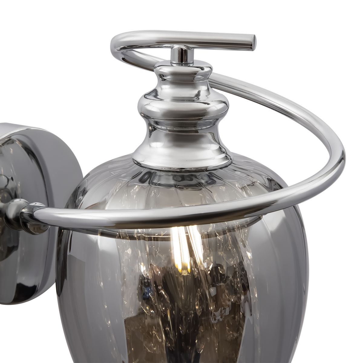 Небольшие светильники с характерными чертами в конструкции станут изюминкой любого интерьера. Изысканная форма стеклянных плафонов сочетается с элегантными подвесками из кристаллов. Свет, отражаясь от тонированной поверхности стеклянной сферы, переливается и играет на их гранях. Арматура сделана из хромированного металла. Высоту подвесных светильников можно отрегулировать длиной шнура.