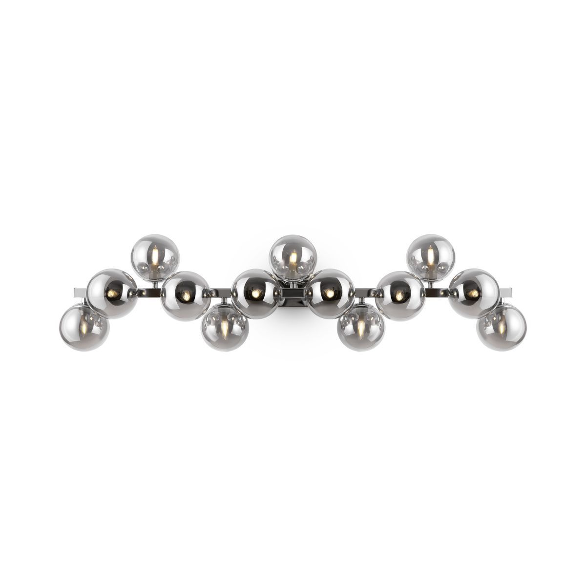 Металлическая арматура в четырех цветах: матовый черный, хром, золото, латунь. Плафоны — выдувное стекло. Цвета — дымчатый, янтарный, коньячный. Дизайн с имитацией молекулярной структуры. Высота подвесных светильников регулируется тросом. Лампа с цоколем G9.