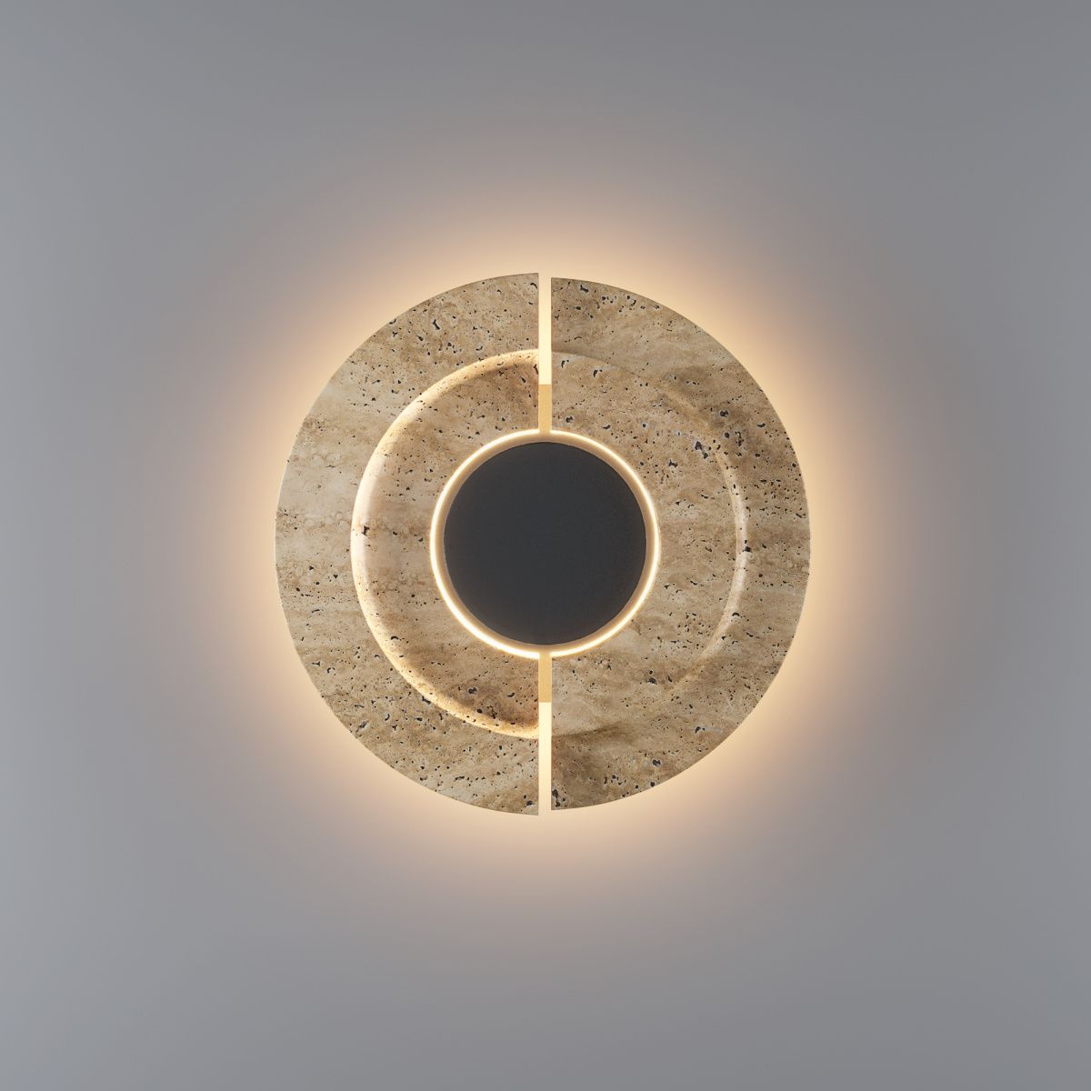 Арматура: металл черный матовый антибликовый. Основной материал: натуральный травертин с уникальным рельефным срезом. LED-источник 3000K, подсвечивающий внутренние грани камня и создающий мягкий ореол на стене. Настенный светильник-артобъект, вдохновленный эстетикой пустыни. Сочетание грубой фактуры камня и строгого металла. Монументальный дизайн с эффектом глубины и таинственности. Для создания акцентного освещения в современных интерьерах.
