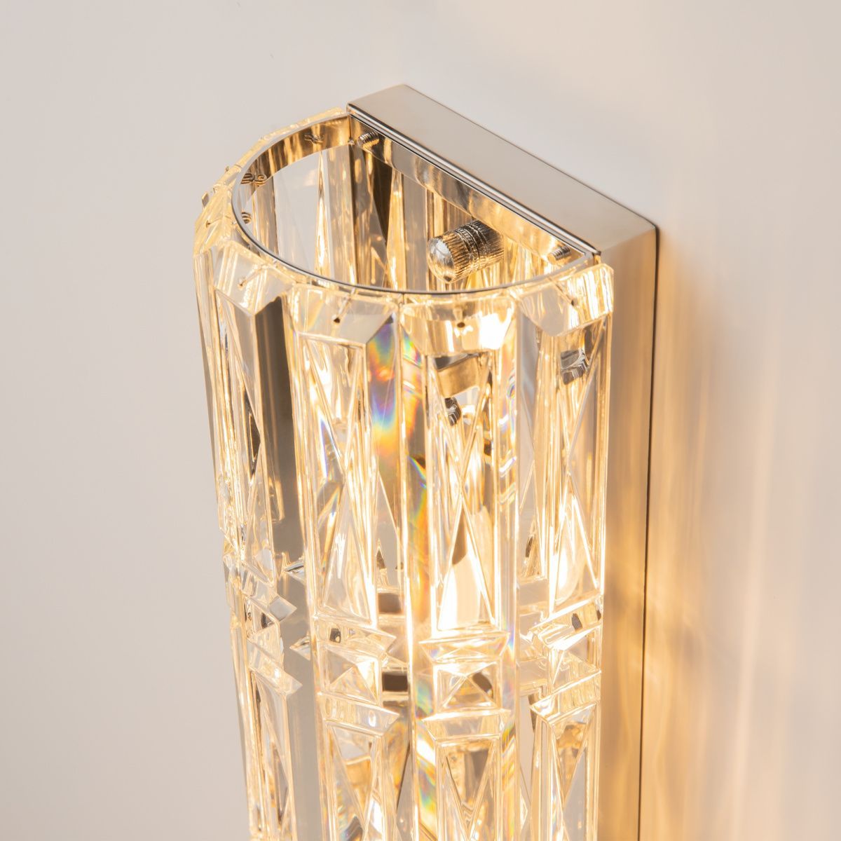 Материал арматуры – металл, оттенки – хром и золото. Декор – прозрачные стек лянные кристаллы. Архитектурная огранка декоративных элементов. Цоколь Е14.