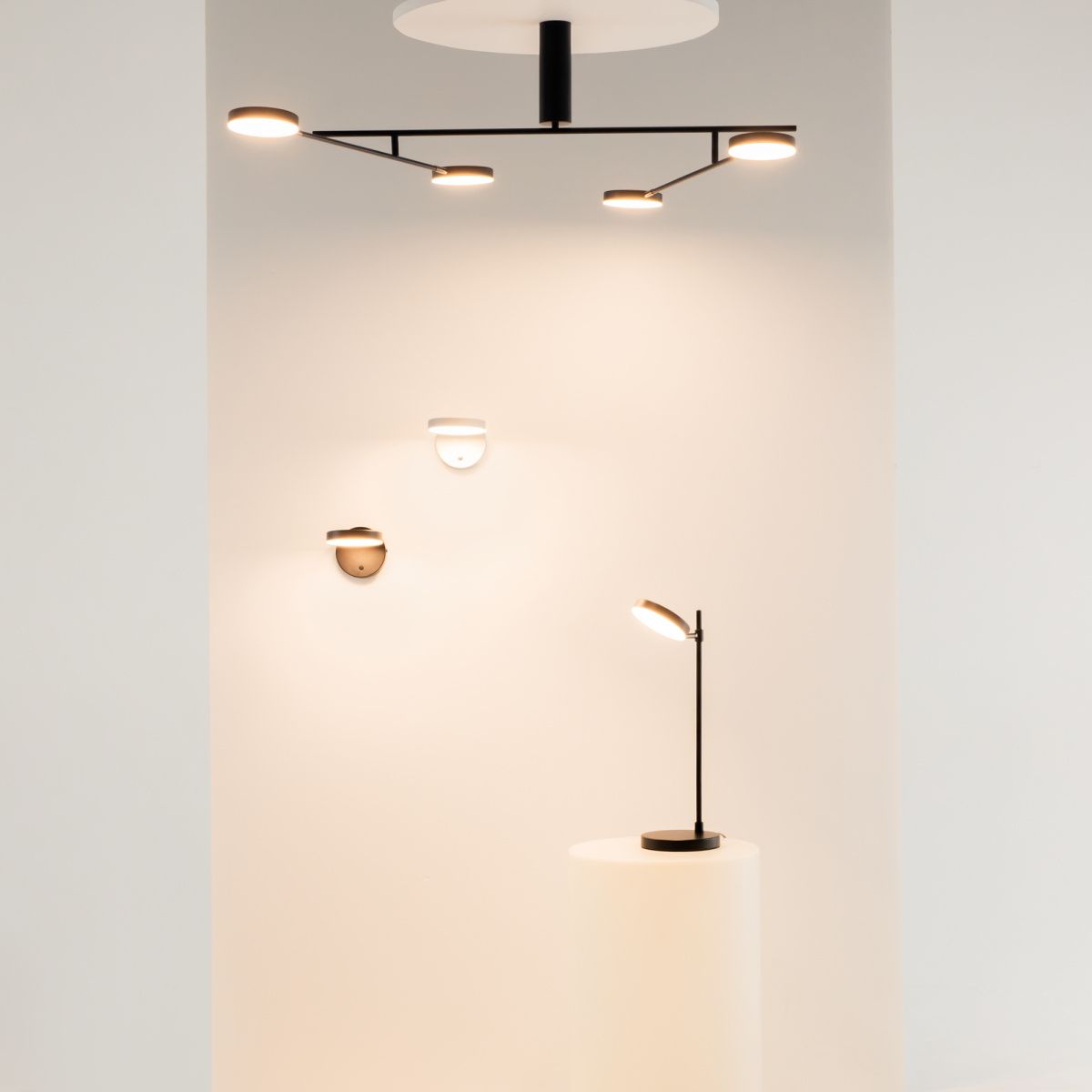Плафоны и арматура из металла. Цвет рассеивателя — белый, арматура черная или белая. Конструкция предусматривает шарнирный механизм, позволяющий регулировать направление света и высоту светильников. Плафоны вращаются на 90 и 360° (в вертикальной и горизонтальной плоскостях). Угол рассеивания — 120 градусов. Тип света — рассеянный.