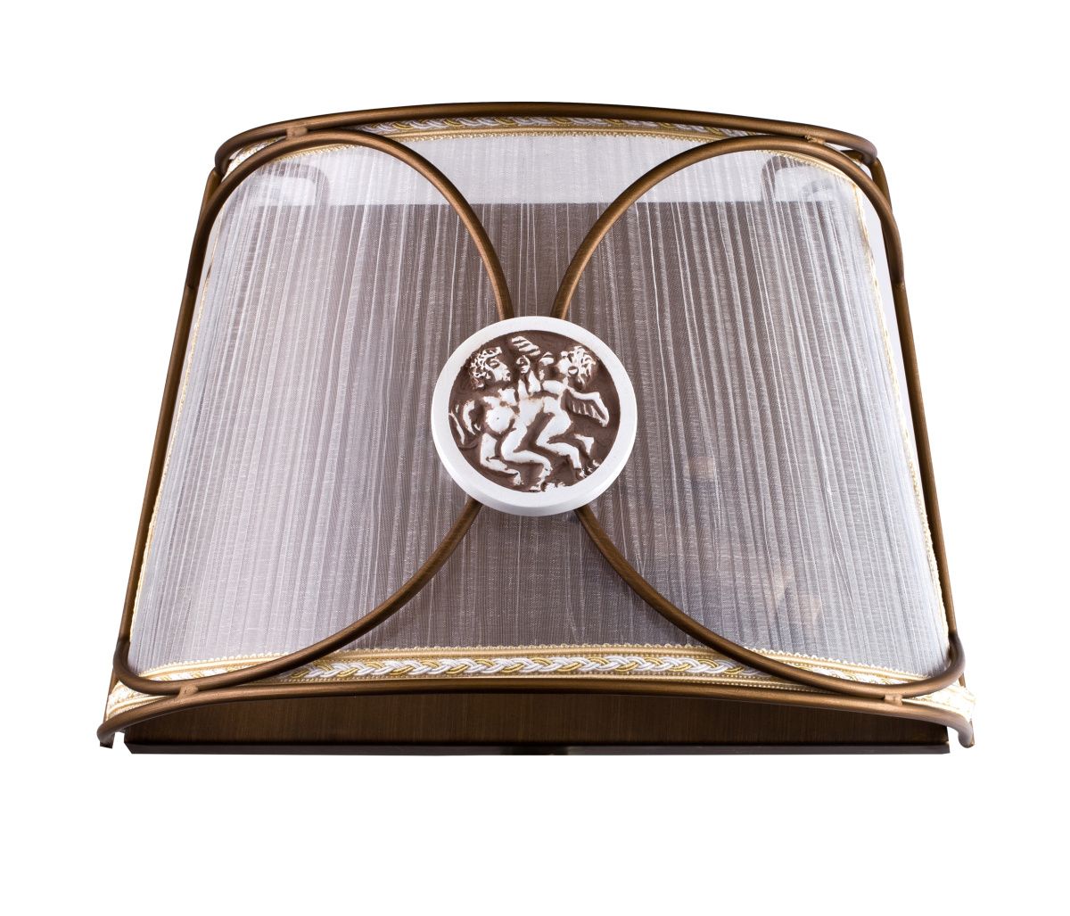 В конструкции светильников использованы декоративные элементы с рельефным изображением жанровой композиции. Благодаря абажуру из плиссированной органзы светильники излучают мягкий рассеянный свет. Отличительной особенностью серии является металлический каркас, который опоясывает абажур и сам служит элементом декора, заметно выделяясь на фоне светлой ткани.