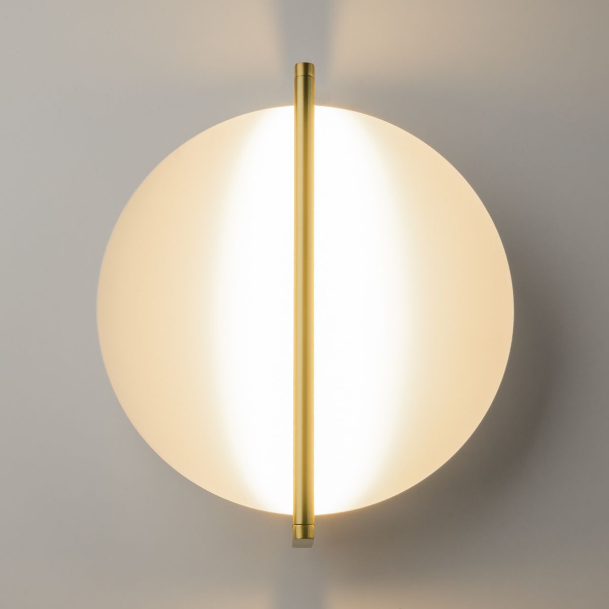 Металлический световой элемент в двух цветах (латунь, черный) со скрытым рассеивателем. Белый матовый диск-отражатель мягко рассеивает свет. Магнитное крепление плафона к арматуре.  LED-источник света, цветовая температура 3000К.