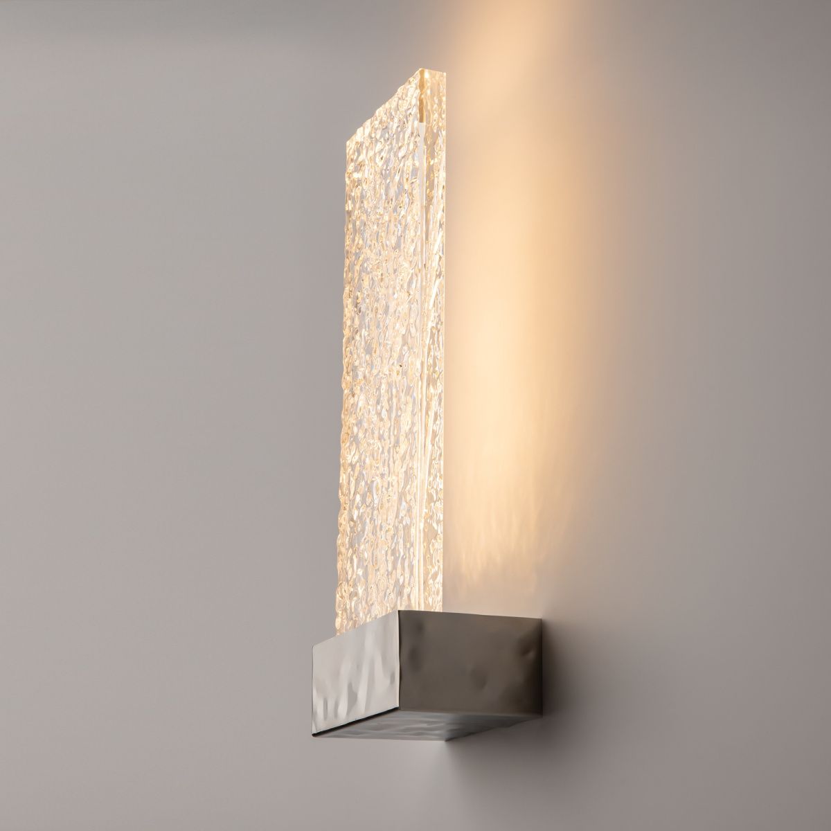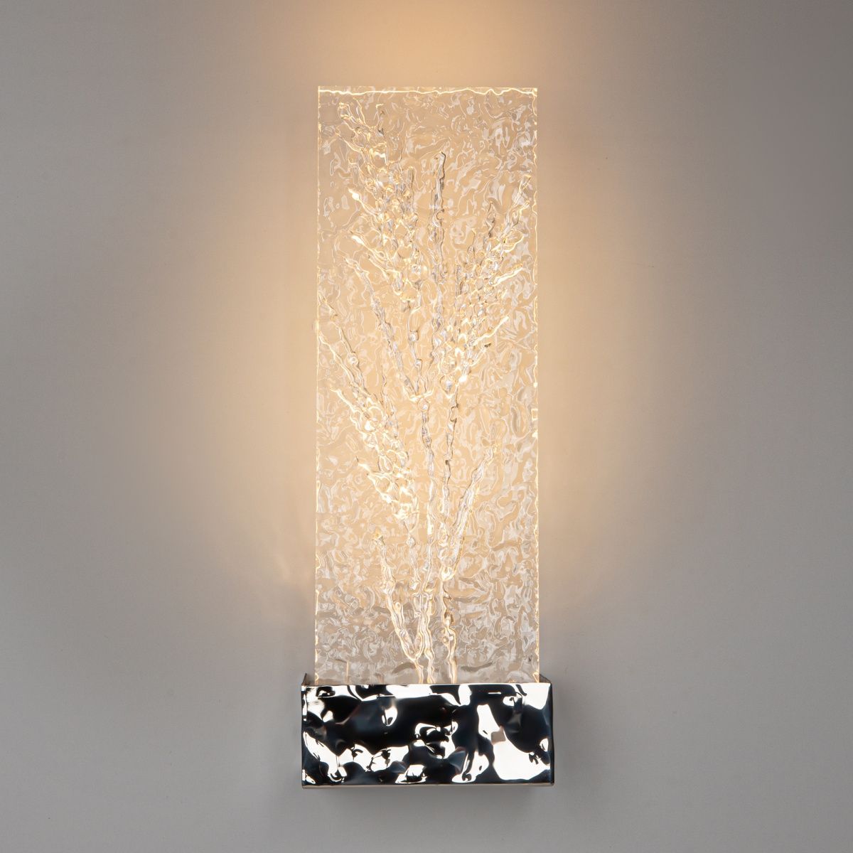 Цвет арматуры — хром, золото. Материал арматуры — нержавеющая сталь. Цветовая температура 3000К. Оригинальный дизайн бра с флористическим рисунком и волнистой поверхностью. LED-источник света. Сочетание рассеянного и переотраженного света. Скрытые монтажные крепления для эстетичного вида. Стеклянный плафон с орнаментом, гармонирующим с основанием. Модели, сочетающие эко-мотивы и статусный дизайн.