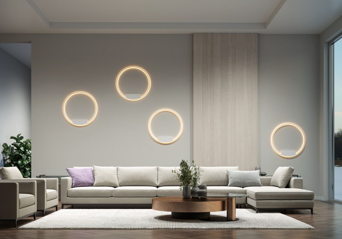Материал арматуры — алюминий, оттенки — черный, латунь. Актуальная форма окружности. Положение колец подвесных моделей регулируется. Бра с источником света, направленным на стену — трендовая отраженная подсветка. Интегрированные LED-источники света. Цветовая температура 3000К или 4000К – устанавливается на этапе монтажа. Диммируемая яркость.