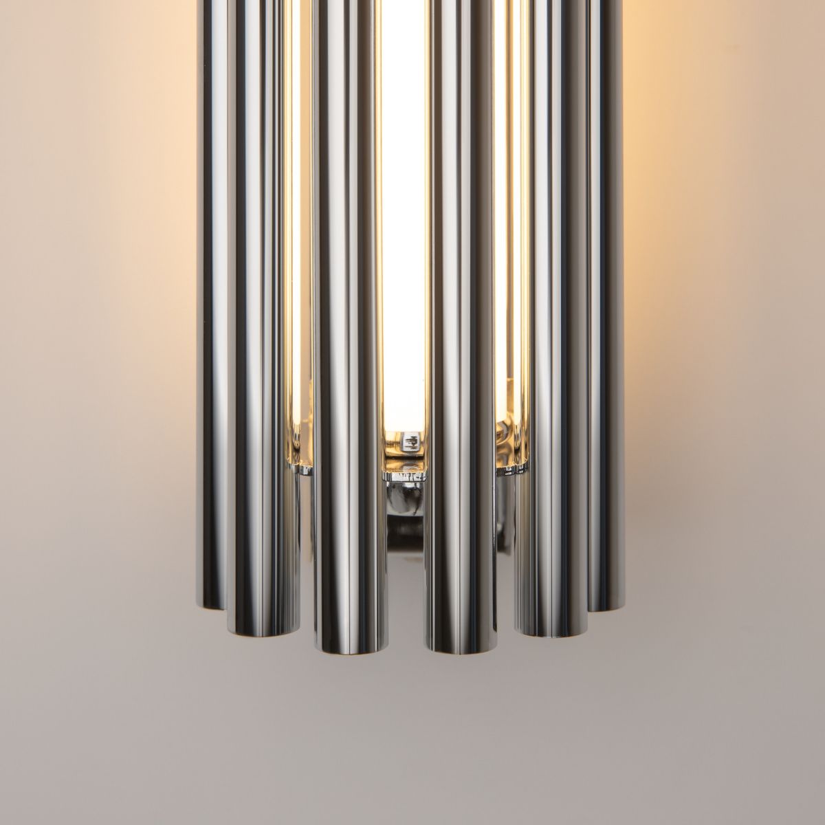 Алюминиевая арматура в двух оттенках: латунь, хром. Мягкий акриловый рассеиватель, плавное распределение света. Декор – металлические трубки в тон арматуре. LED-источник света, цветовая температура 3000К.