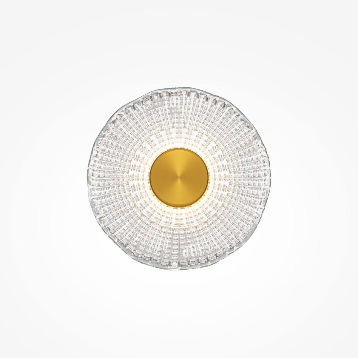 Металлическая арматура, цвет - латунь. Декоративные плафоны из литого стекла. Они рассеивают свет и дают легкие блики на стенах. Стекло плафонов может быть прозрачным или тонированным с паттерном молочного оттенка. Встроенный LED-источник света имеет цветовую температуру 3000 К, угол рассеивания — 120 градусов.