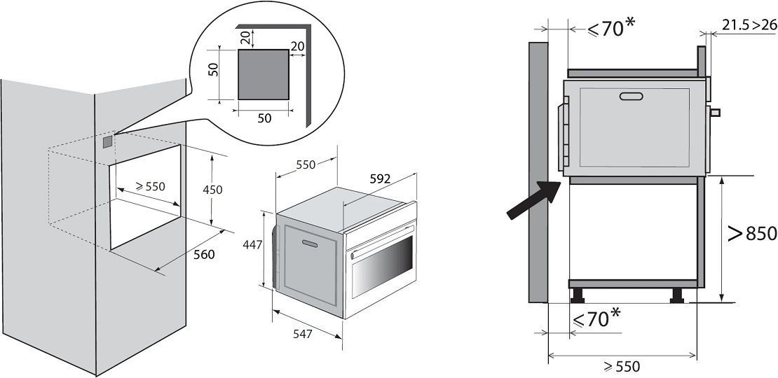 - Размеры ниши для встраивания (ВхШхГ): 450х560х550 мм