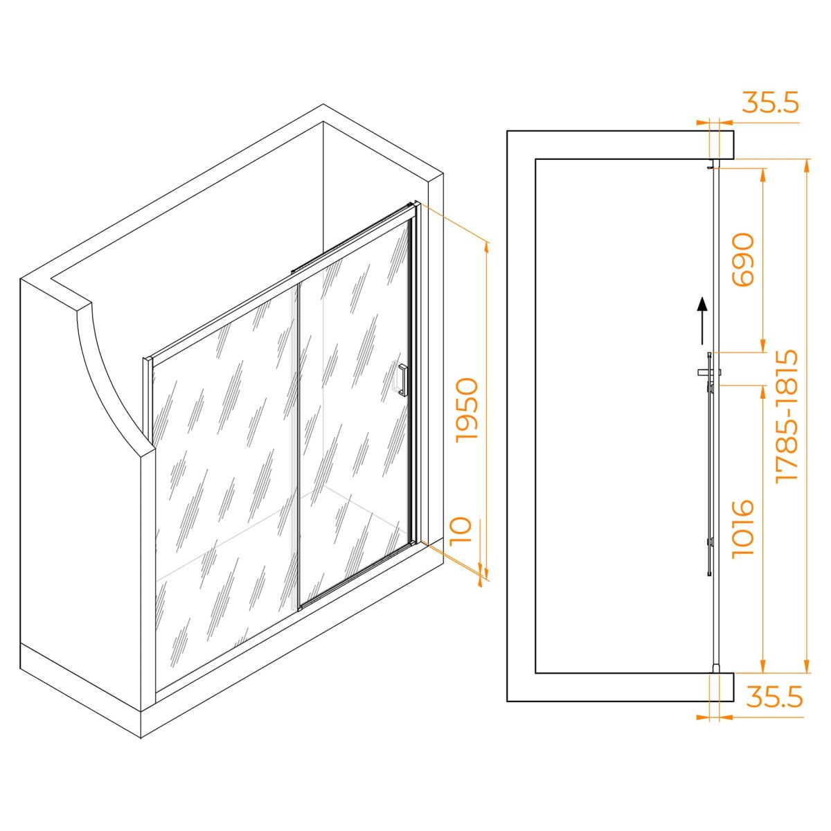 Профиль цвета хром из анодированного алюминия гарантирует прочность и долговечность. Высота двери составляет 1950 мм, а класс утечки 2 предотвращает попадание воды на пол.
