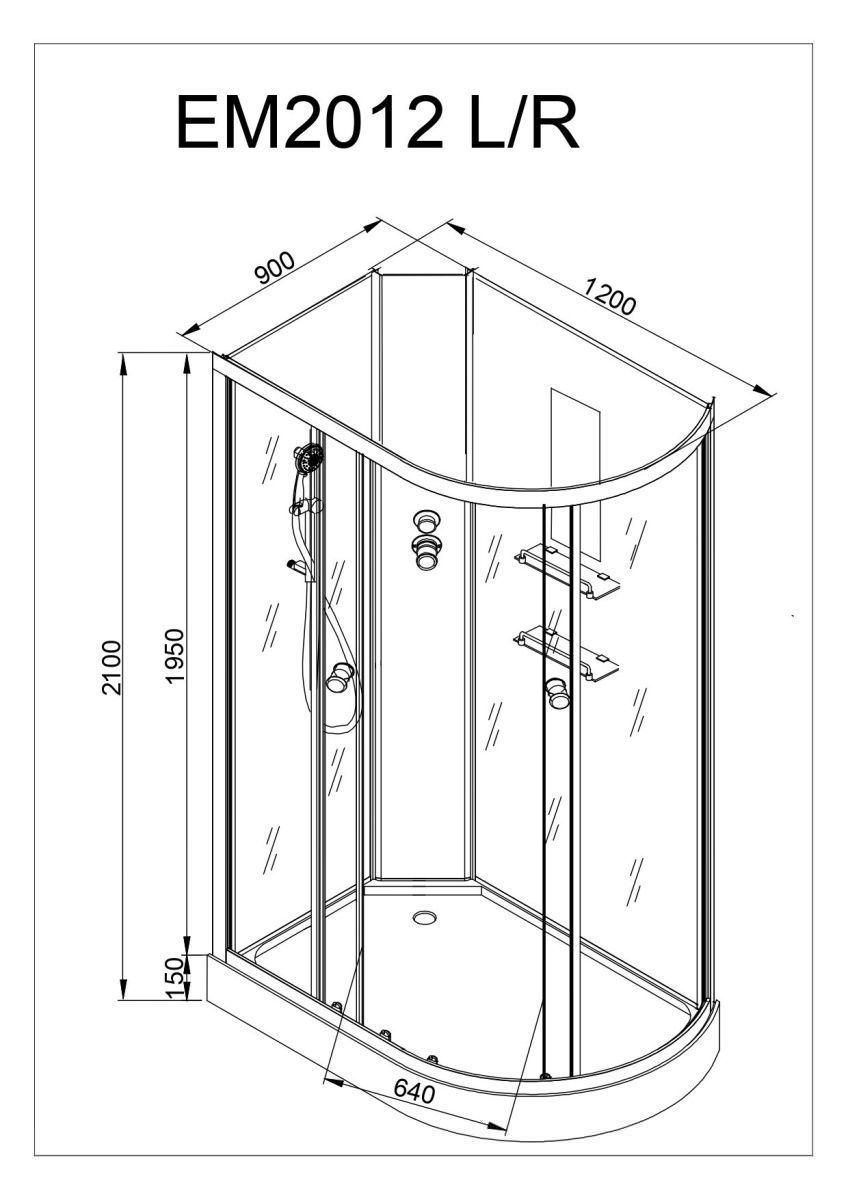 Стильная душевая кабина с внутренней сборкой AvaCan EM 2012 N L сочетает в себе высокую функциональность, практичность и надежность. Для изготовления применяют безопасное закаленное стекло толщиной 5 мм, надежно фиксируемое алюминиевым профилем. Цвет профиля хром. В комплекте зеркало, переключатель режимов, смеситель, полочки,вставка в поддон.
