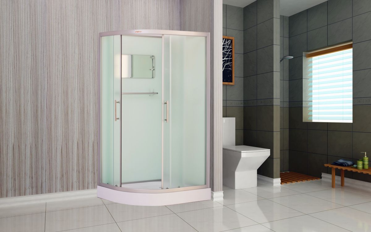 Низкий поддон. Сифон с гидрозатвором. Стекло: 5 мм, переднее - "матовое". заднее - "белое крашеное "с интегрированным зеркалом 65х30. Комплектующие: полочка со стаканчиком, смеситель, 3-х режимная душевая лейка на стойке, мыльница, двойные ролики. Модель "С" - угловая кабина (без крыши).