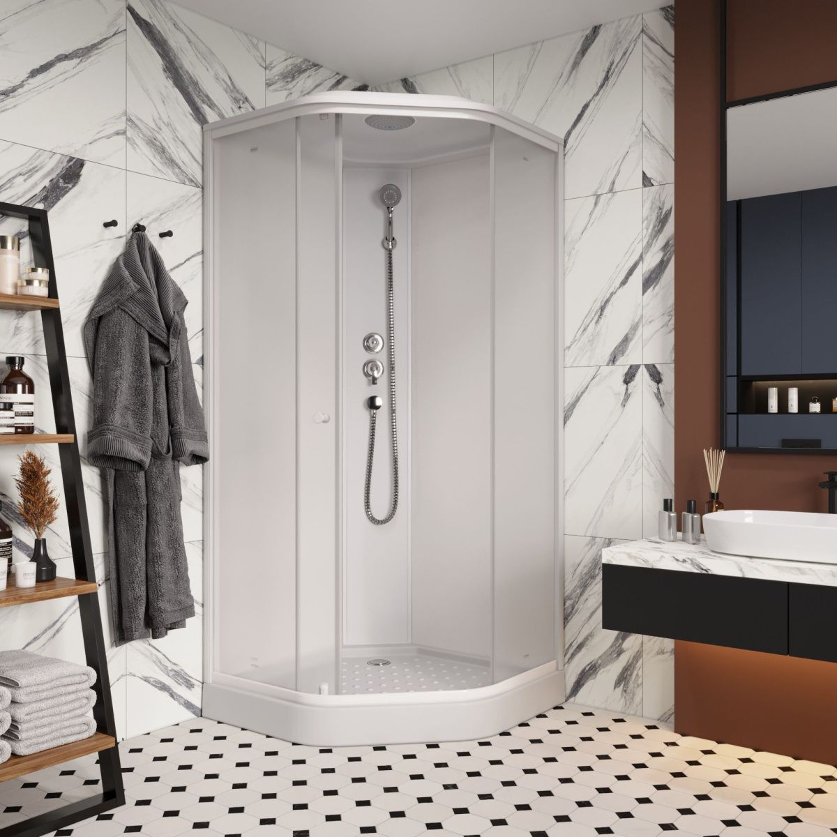 Поддон: белый, низкий (12 см), трапециевидный, рифленый.