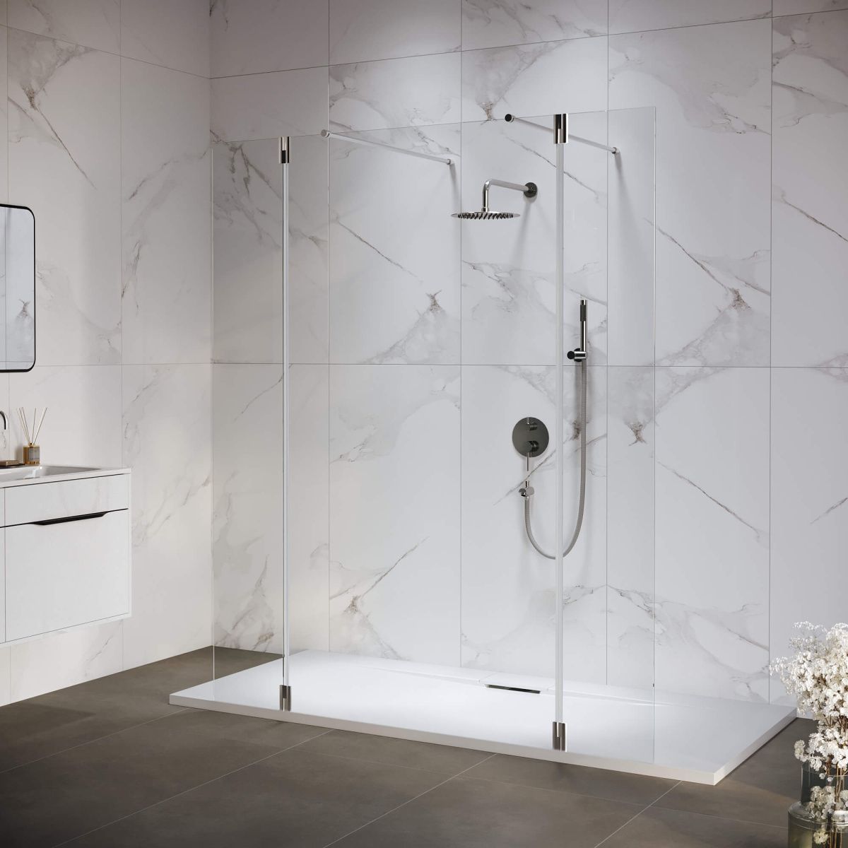 WA-052 оснащена двумя подвижными стеклами из закаленного стекла, которые легко крепятся к стационарному стеклу перегородки с помощью усиленных петель из нержавеющей стали AiSi 304. Петли с герметичным поворотным механизмом и маятниковой системой позволяют открывать приставные стекла наружу для удобного доступа в душевое пространство или закрывать их внутрь, частично закрывая вход и предотвращая брызги во время водных процедур.