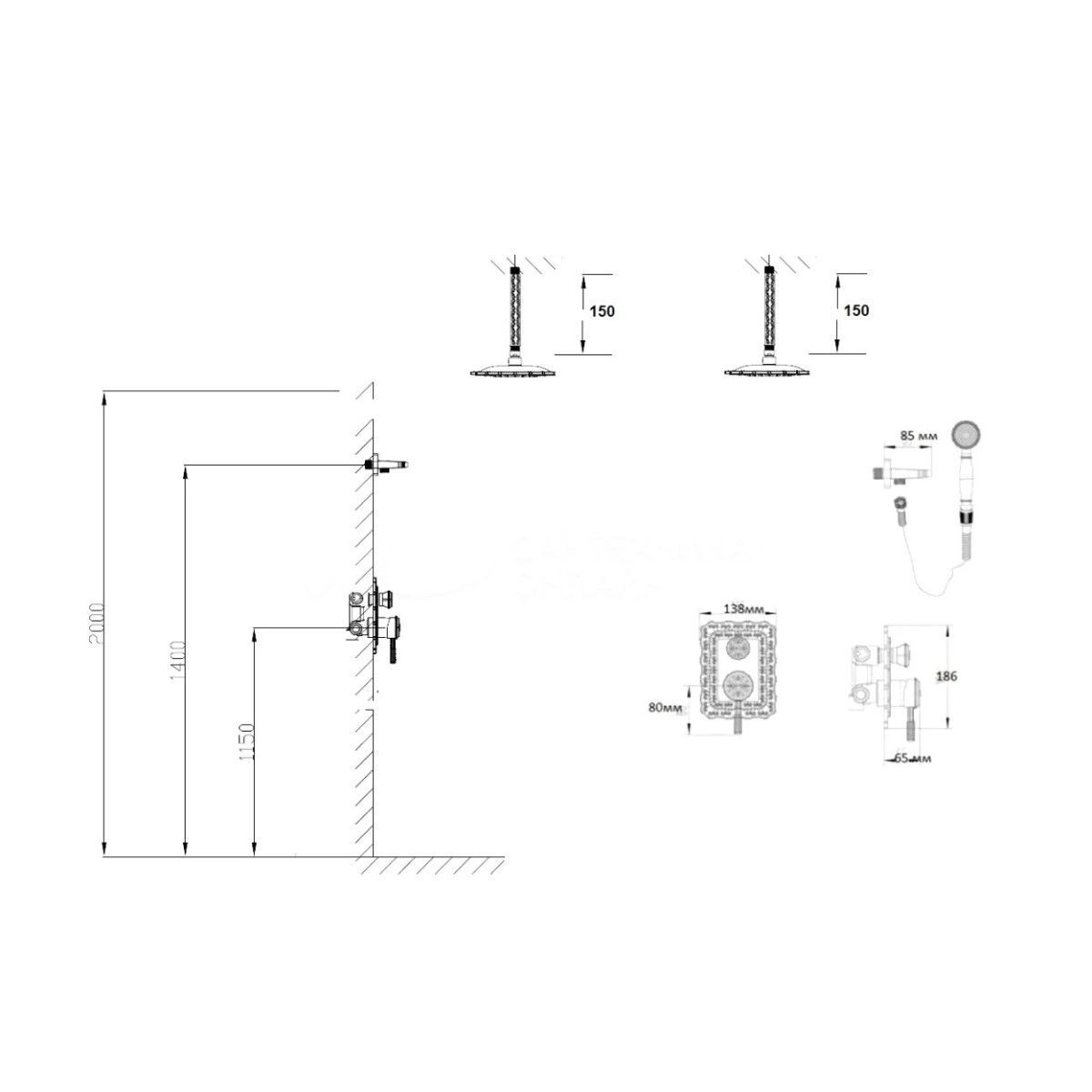 смеситель, верхний душ, кронштейн верхнего душа, шланговое подключение с держателем лейки, душевая лейка, шланг