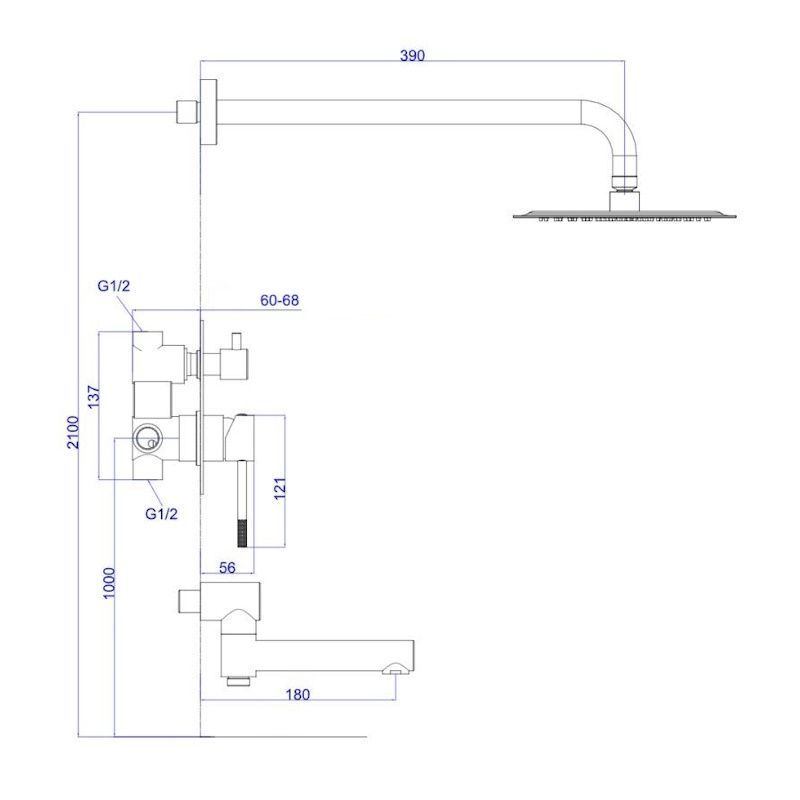 смеситель, внутренняя часть, шланговое подключение с держателем лейки, душевой шланг, верхний душ с кронштейном, излив