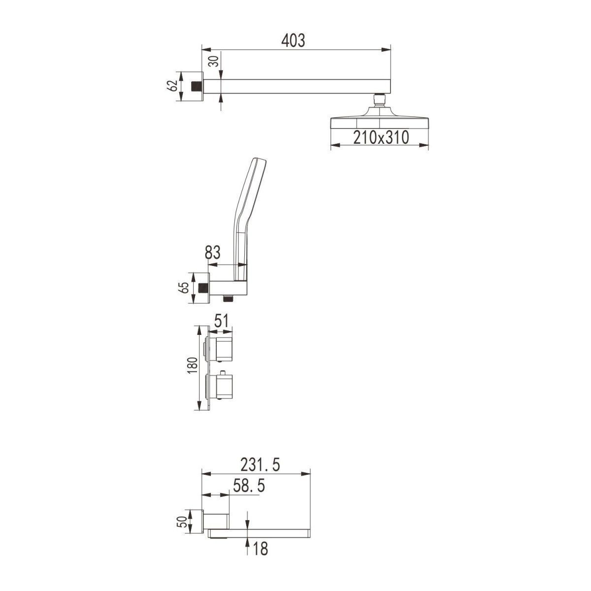 смеситель, верхний душ, кронштейн верхнего душа, шланговое подключение с держателем душевой лейки, душевая лейка, шланг, излив