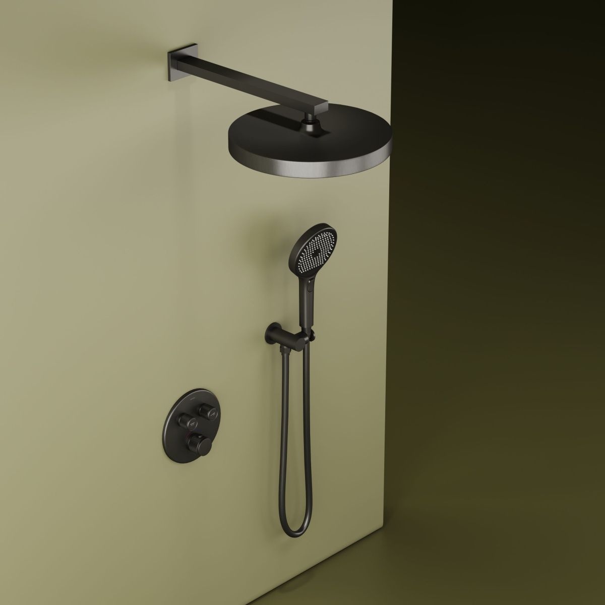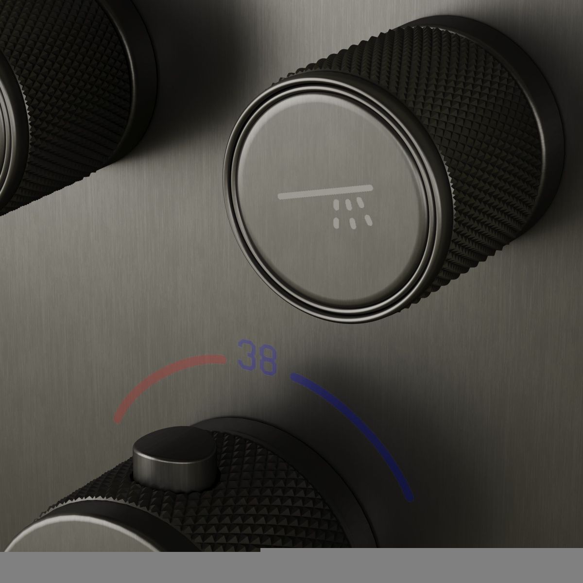Встраиваемая душевая система с функцией обогащения воды воздухом. Полный комплект для установки. Встраиваемый термостатический смеситель с внутренним блоком в комплекте. Удобное кнопочное управление между источниками воды. Базовая настройка температуры воды - 40 градусов. Возможность регулировки потока воды для каждого источника. Ручки управления потоком воды с насечками для противоскользящего эффекта в условиях мокрых рук. Верхний тропический душ с регулировкой наклона потока воды. Многофункциональный ручной душ - 4 режима пока воды, диаметр лейки - 130 мм, кнопкадля переключения между режимами. Гибкий шланг с защитой от перекручивания в комплекте Цвет - вороненая сталь Надежное покрытие методом PVD