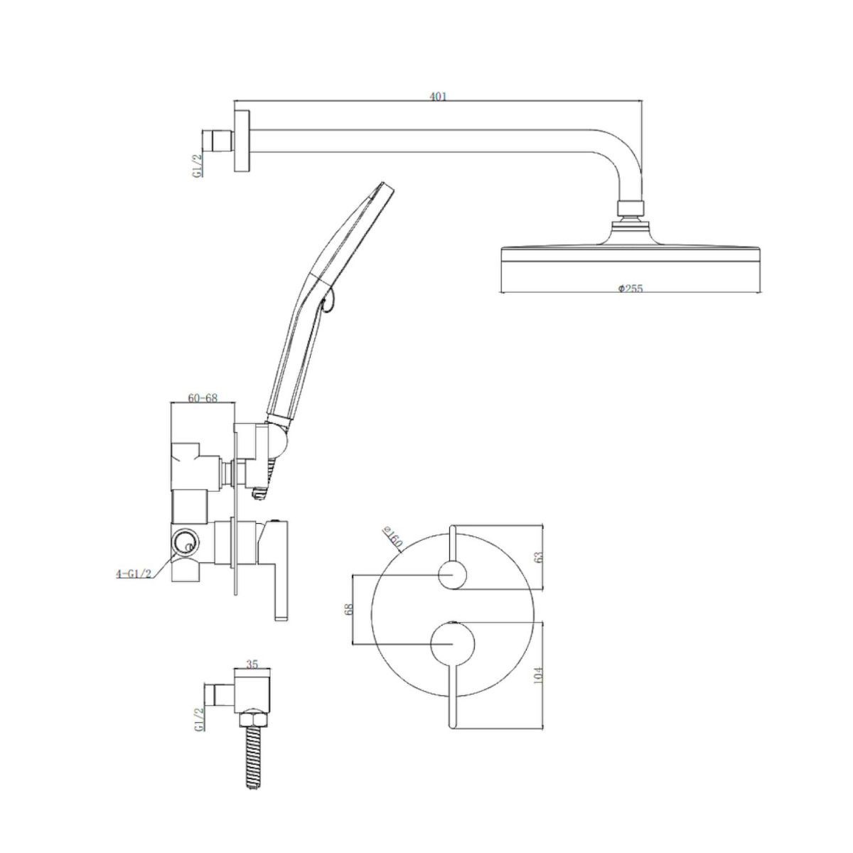 смеситель, внутренняя часть, шланговое подключение с держателем лейки, душевой шланг, верхний душ с кронштейном, излив