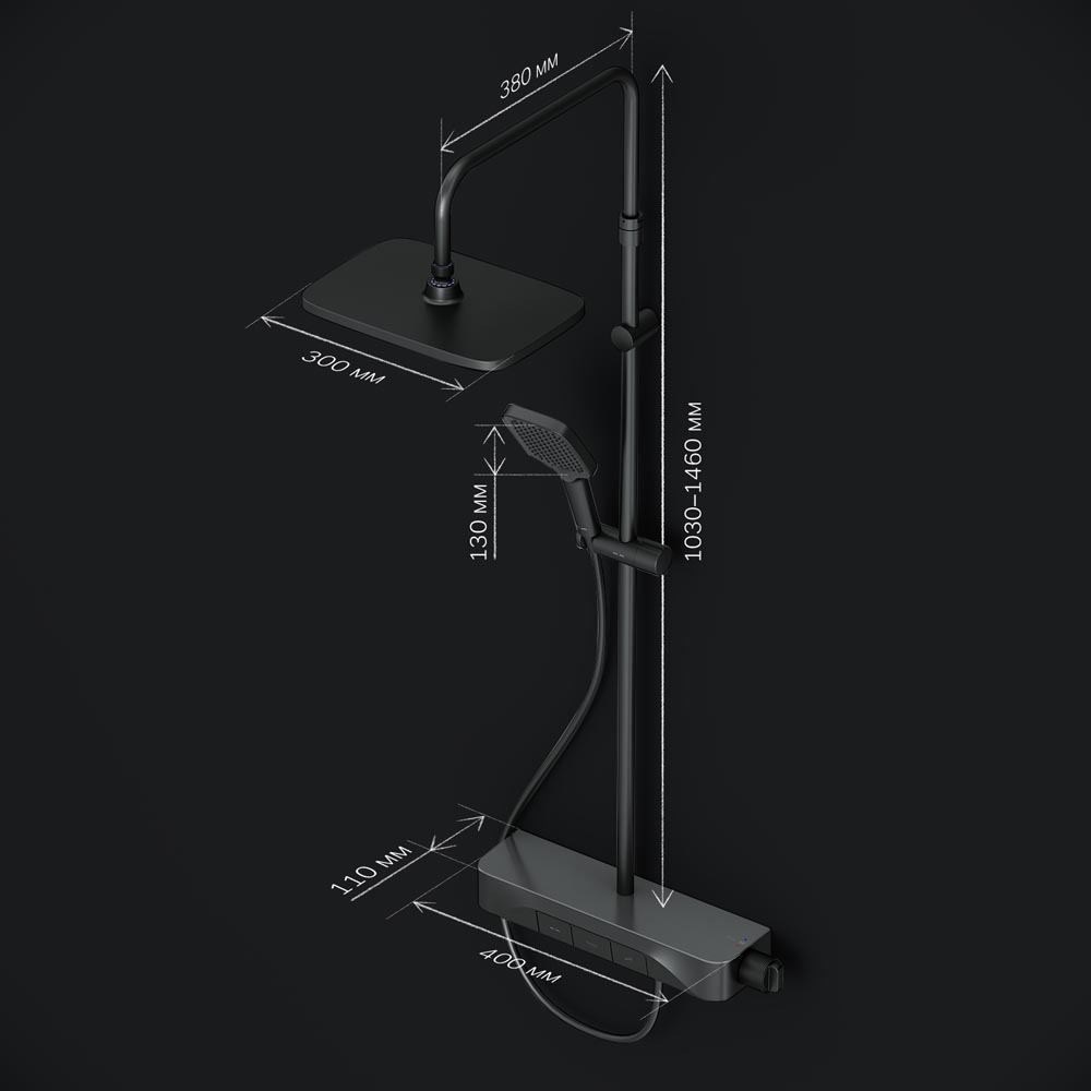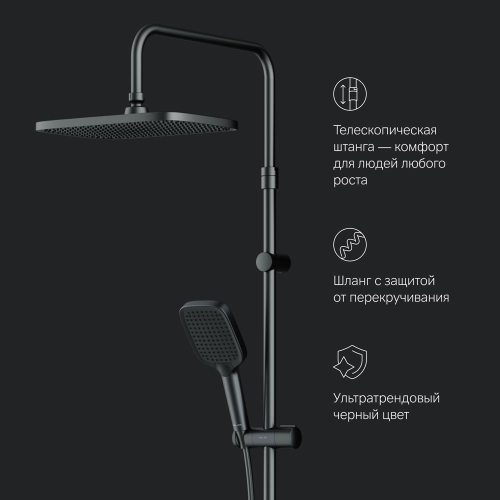 Телескопическая штанга регулируется по высоте в диапазоне от 1030 до 1460 мм обеспечивая комфорт для людей любого роста. А трендовая прямоугольная форма и увеличенный размер тропического душа подарят вам ощущения настоящего домашнего SPA.