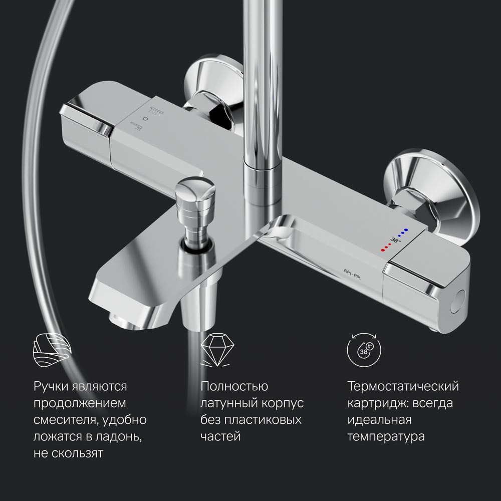 Смеситель для душа с термостатом: термостатический картридж с высокочувствительным термоэлементом и стопором безопасности на 38 градусах надежно защитит вас от ожога даже при внезапном отключении холодной воды.