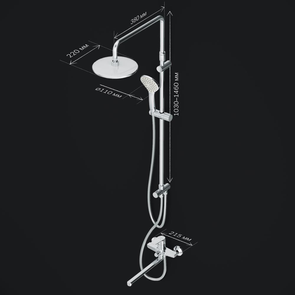 Поворотный излив 322 мм позволит с легкостью наполнять емкости. Функциональная душевая система. Поворотная и телескопическая душевая штанга позволит индивидуально настроить расположение верхнего душа в диапазоне от 1 030 мм до 1 460 мм. Широкий верхний душ 220 мм ручной душ 110 мм душевой шланг с защитой от скручивания.