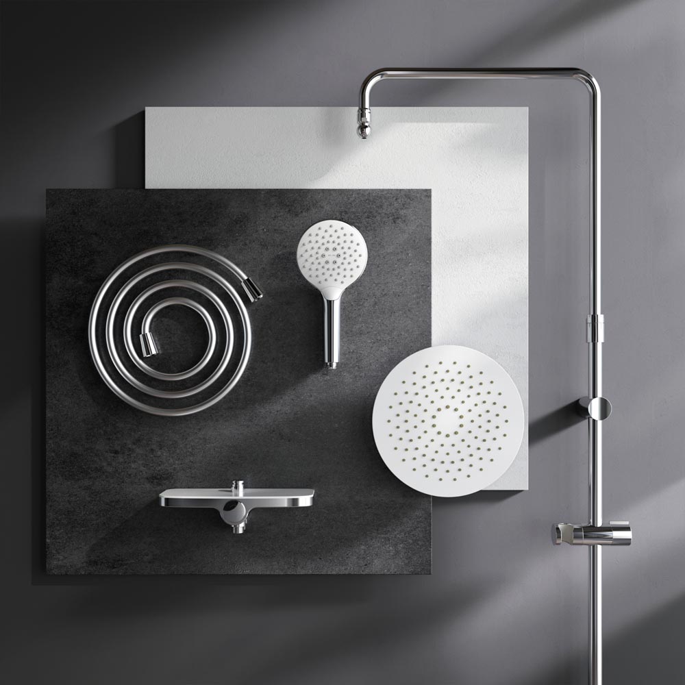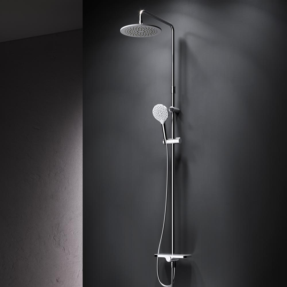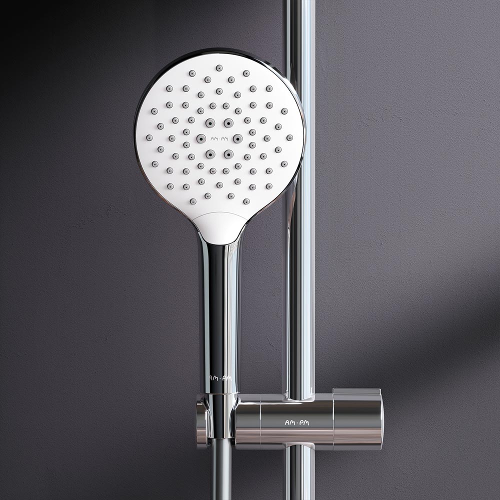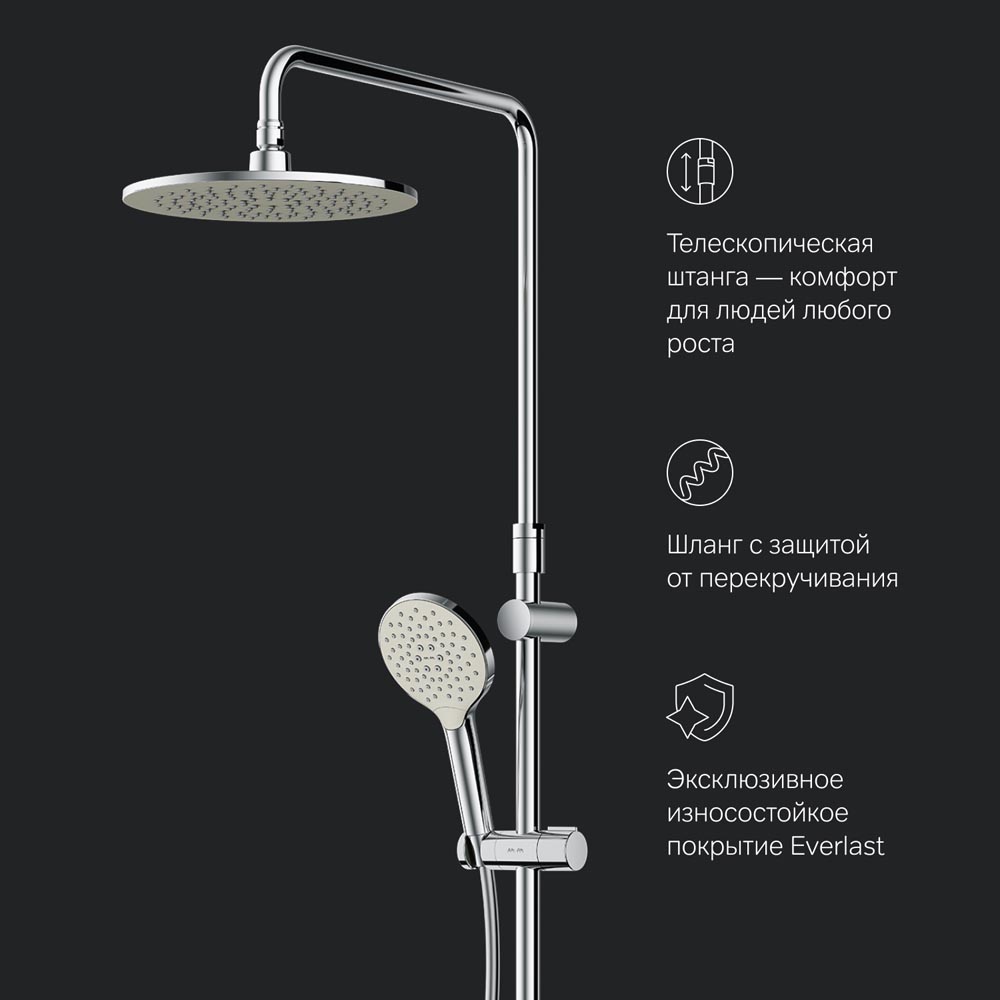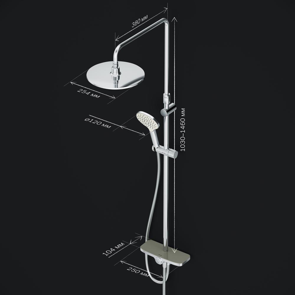 Премиальные размеры и продуманные детали: увеличенный диаметр душевых леек (верхний душ 254 мм и ручной душ 120 мм) позволит ощутить преимущества тропического душа тогда как увеличенная длина шланга 1750 мм обеспечит свободу движений во время принятия душа. Телескопическая поворотная штанга регулируется по высоте в диапазоне от 1030 до 1460 мм обеспечивая комфорт для людей любого роста а шаровой шарнир в держателе верхнего душа позволяет регулировать угол его наклона.