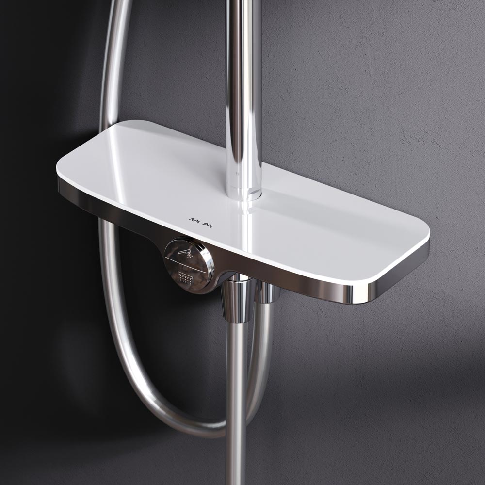 Нижнее крепление штанги выполнено в виде полочки а переключатель верхний-ручной душ является ее продолжением. Нажав на него вы можете менять источник потока воды от ручной лейки к верхнему душу.