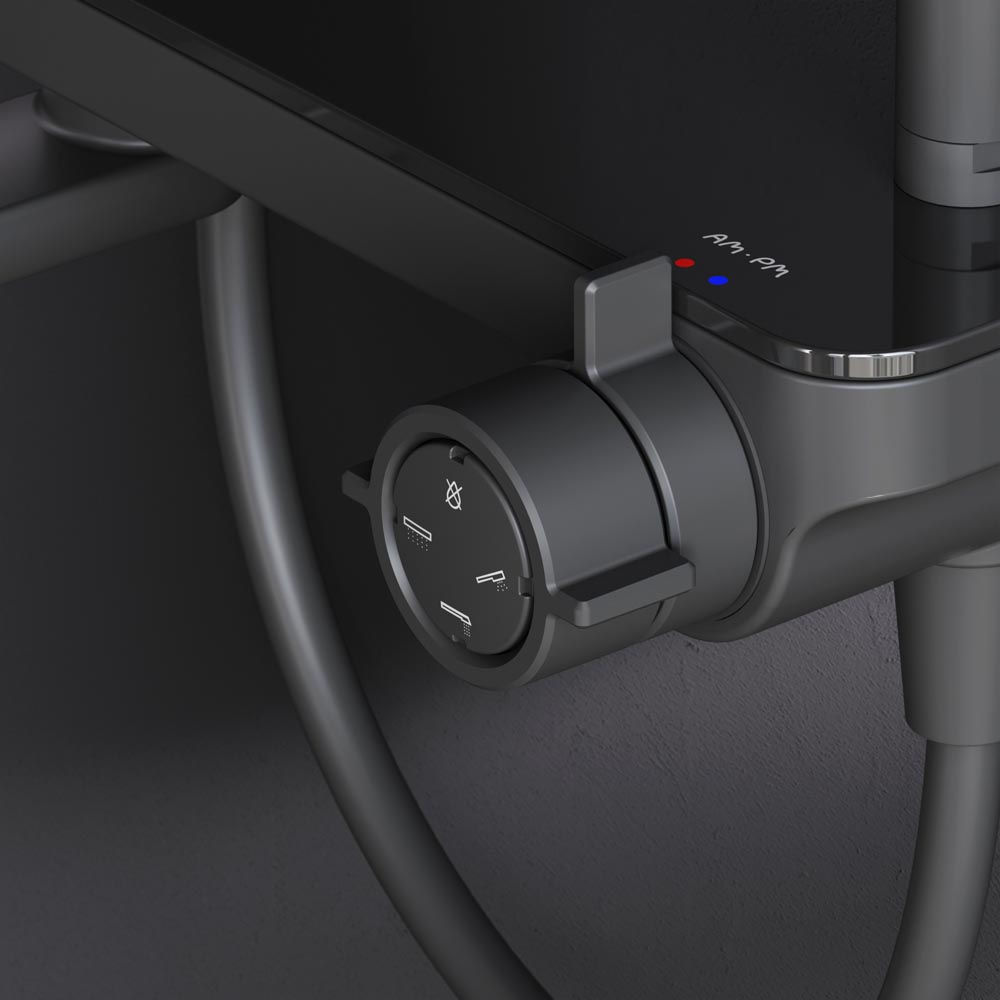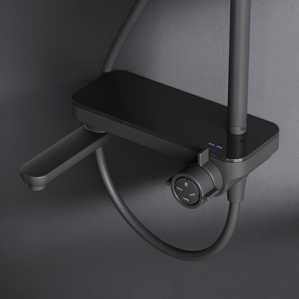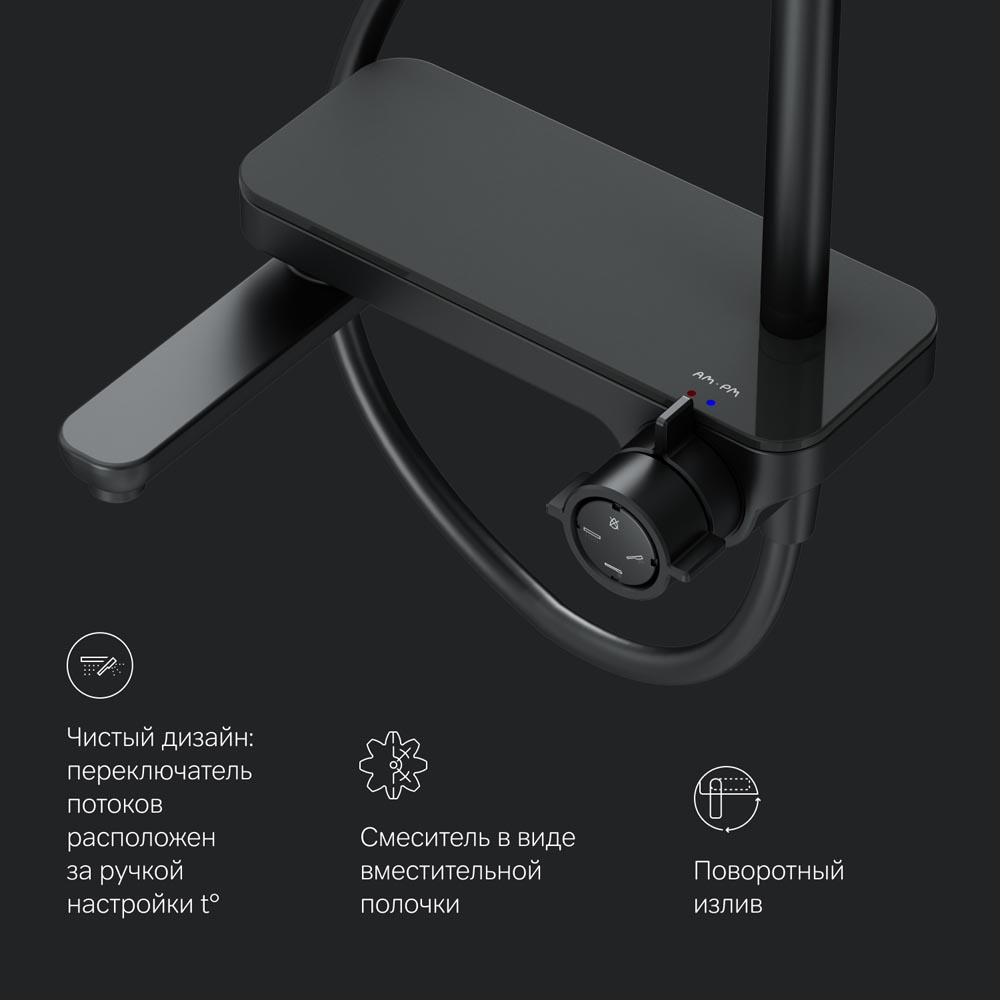 Смеситель выполнен в виде полочки. Чистый дизайн без лишних деталей: переключатель расположен за ручкой настройки температуры и позволяет менять источник потока воды от ручной лейки и излива до верхнего душа.