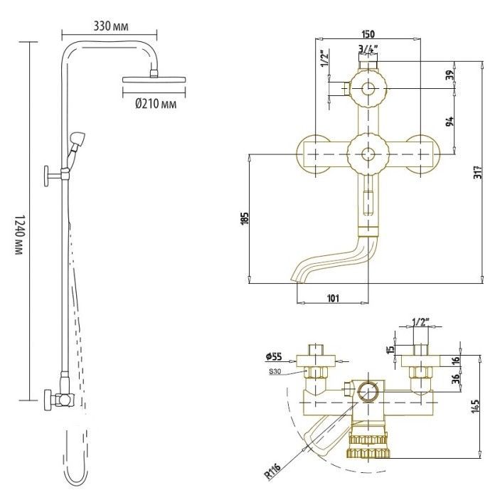 смеситель, верхний душ, душевая стойка, лейка, держатель лейки, шланг, эксцентрики, декоративные отражатели
