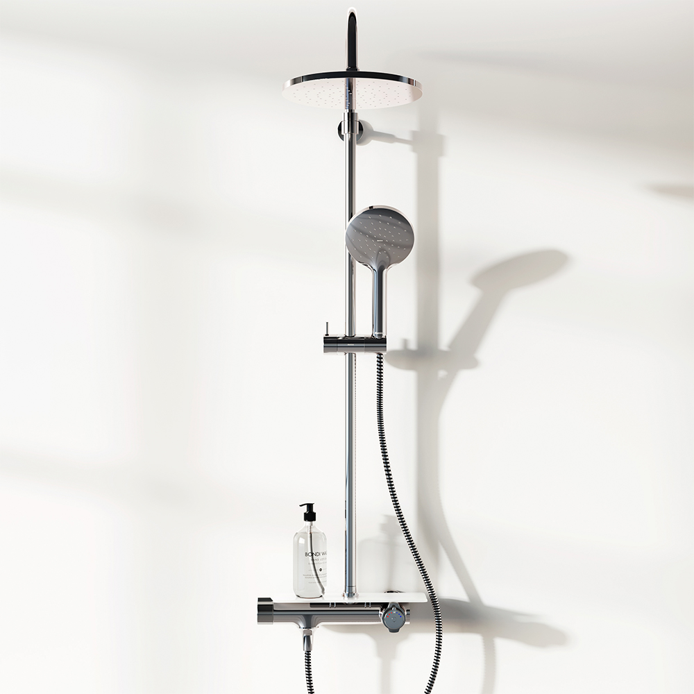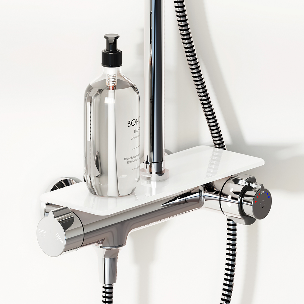 Непревзойдённый комфорт и удобство: смеситель выполнен в виде компактной полочки где вы можете хранить все необходимые вещи. Благодаря телескопической штанге с диапазоном регулировки 400 мм ежедневные процедуры будут одинаково комфортны для людей любого роста. Большое количество форсунок с микроотверстиями которые распределяют поток мягкими равномерными струями обеспечит вам расслабляющий эффект настоящего домашнего SPA.
