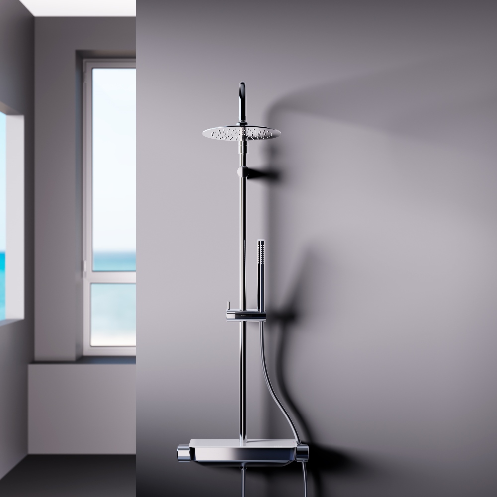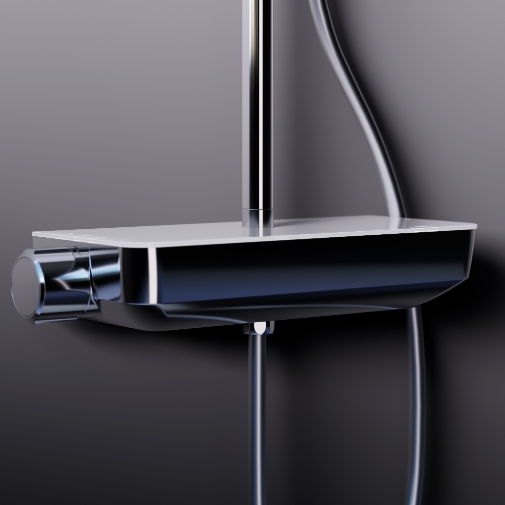 Непревзойдённый комфорт и удобство: смеситель выполнен в виде компактной полочки из закаленного стекла где вы можете хранить все необходимые вещи. Увеличенный диаметр верхнего душа с возможностью регулировки угла наклона и ручная лейка в трендовой форме стика подарят вам полный спектр ощущений - помогут взбодриться утром и расслабится вечером. Переключайте потоки воды между ручной и тропической лейками плавным поворотом левой ручки смесителя.