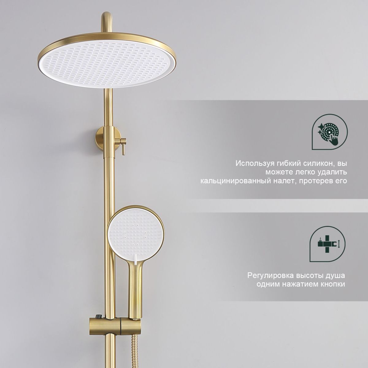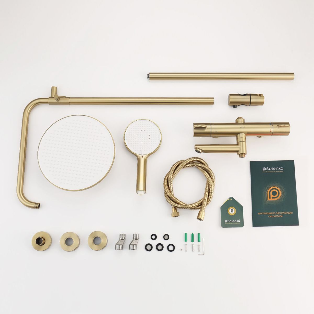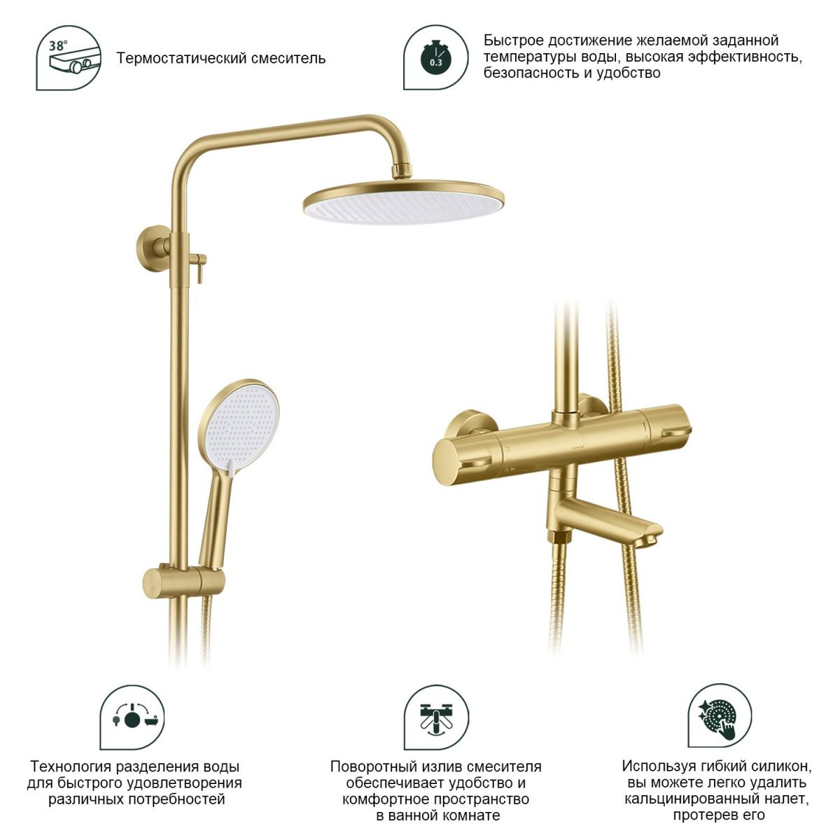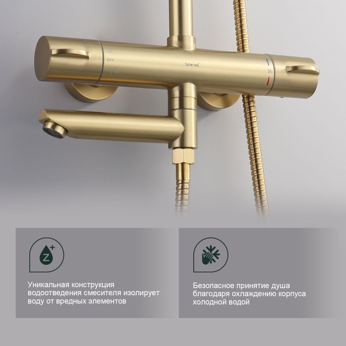 Душевая система с термостатом Splenka S223.26.03, сатин золотой. Душевая система термостатическая подходит для ванны и душа. Излив у системы поворотный. Излив - функция переключения режима. Верхний душ имеет круглую форму. Верхний душ - ∅250мм. Ручная лейка у системы 3-х режимная. Лейки изготовлены из авс-пластика. Термостатический картридж - R502.551. Переключатель с керамическими пластинами (угол поворота – 180°) - R505.01. Переключатель в изливе - R501.527. Аэратор - S540.721.03.   Душевой шланг 1.5м - S401.15.03.