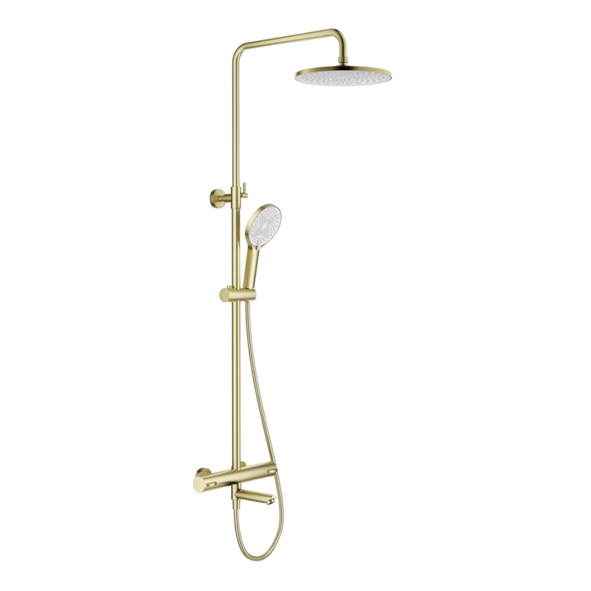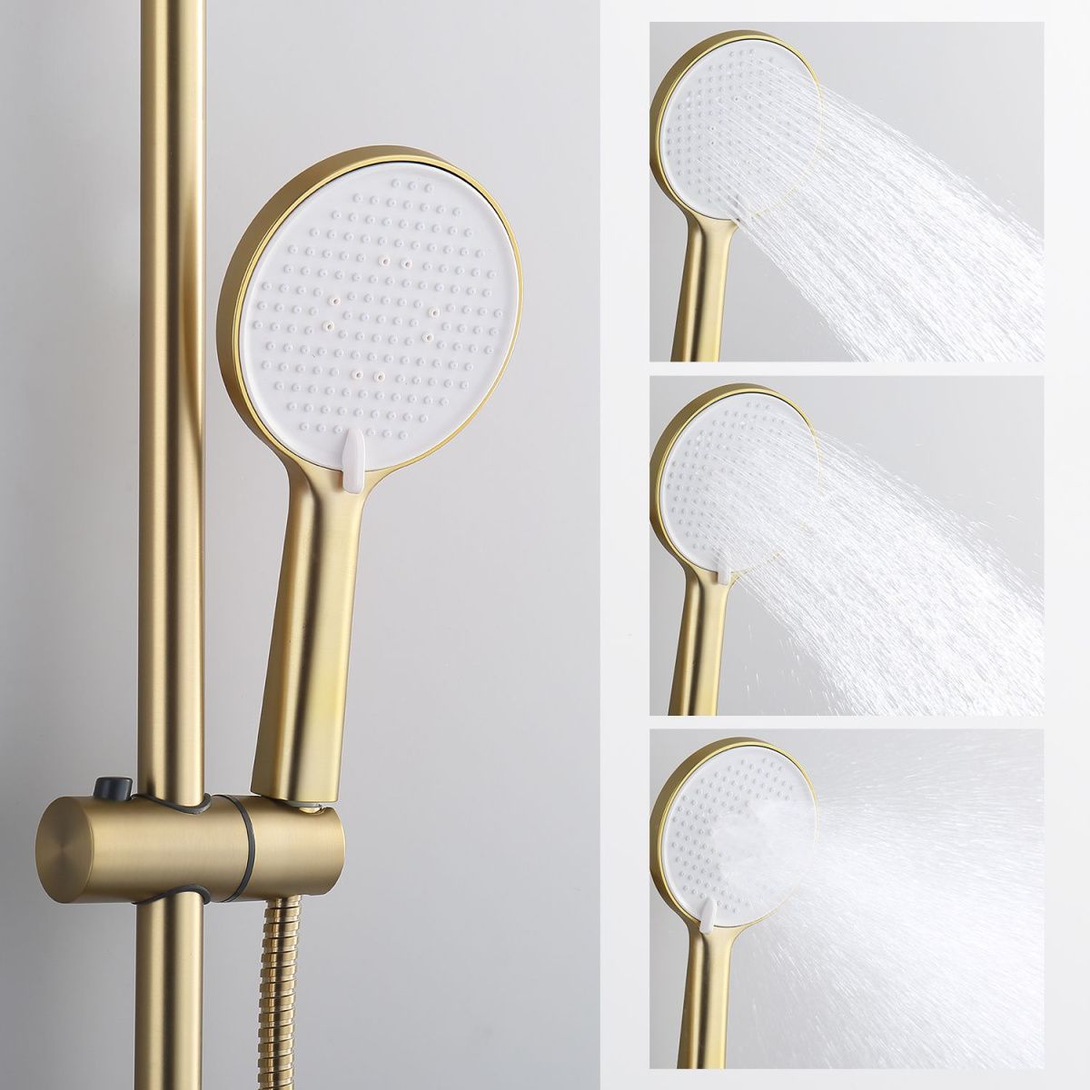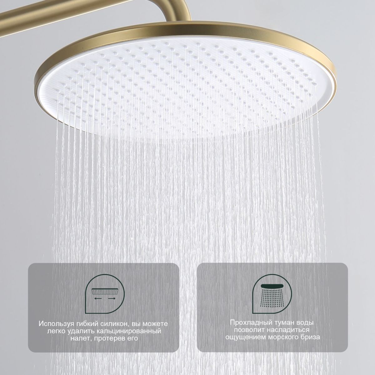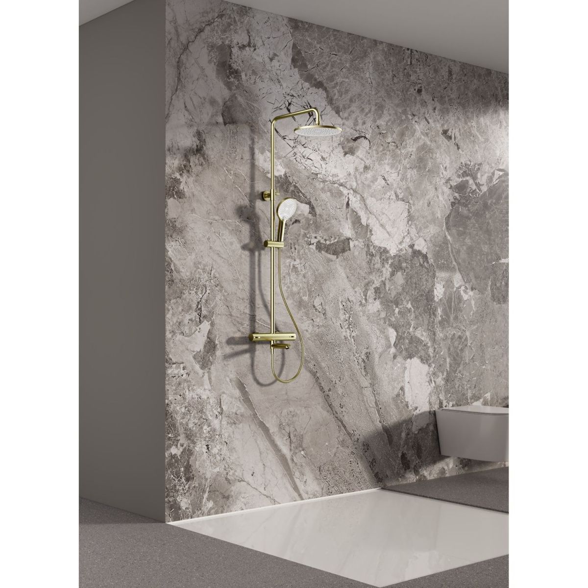 Душевая система с термостатом Splenka S223.26.03, сатин золотой. Душевая система термостатическая подходит для ванны и душа. Излив у системы поворотный. Излив - функция переключения режима. Верхний душ имеет круглую форму. Верхний душ - ∅250мм. Ручная лейка у системы 3-х режимная. Лейки изготовлены из авс-пластика. Термостатический картридж - R502.551. Переключатель с керамическими пластинами (угол поворота – 180°) - R505.01. Переключатель в изливе - R501.527. Аэратор - S540.721.03.   Душевой шланг 1.5м - S401.15.03.