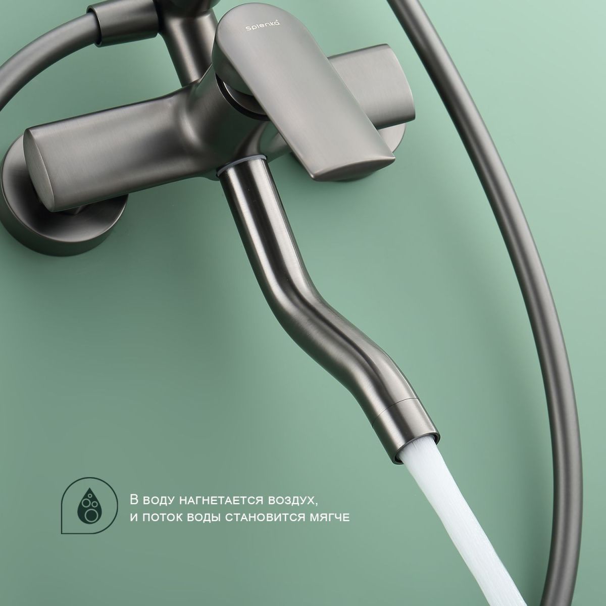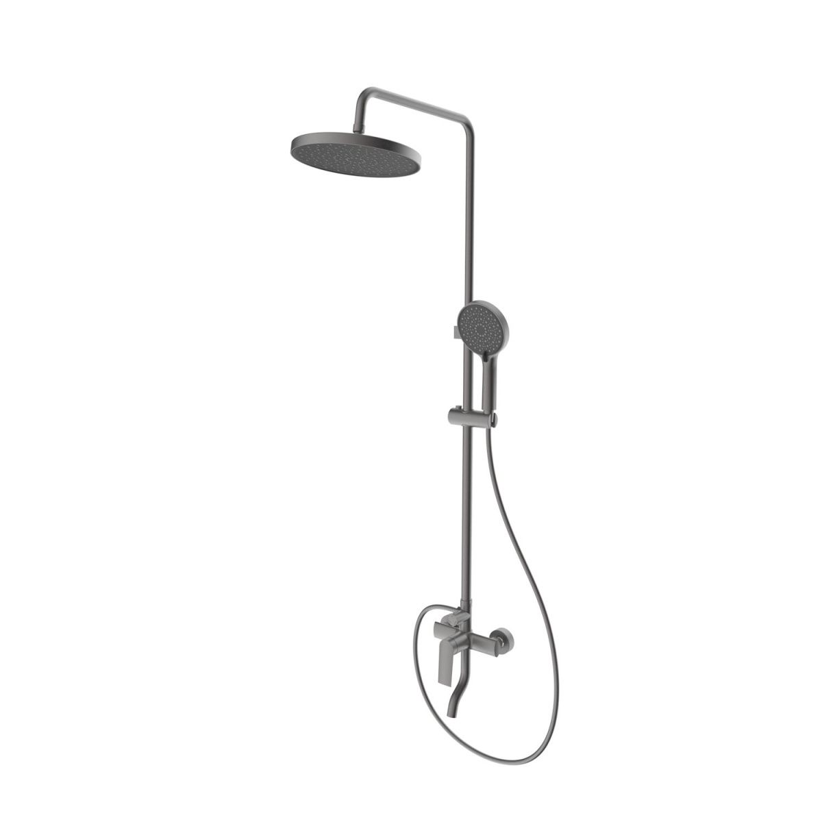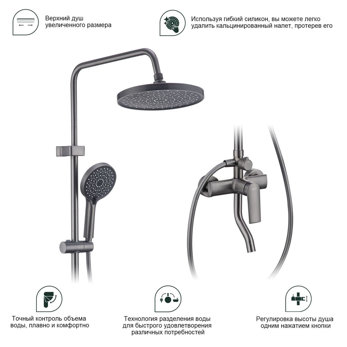 Душевая система Splenka S50.24.09, графит.  Душевая система подходит для ванны и душа. Верхний душ имеет круглую форму размером 25 см. Ручная лейка у системы 3-х режимная. Лейки изготовлены из авс-пластика. Керамический картридж 35мм - S500.35. Переключатель с керамическими пластинами (угол поворота – 360°) - S540.541. Аэратор - S540.722.09.   Душевой шланг 1.5м - S403.15.09.