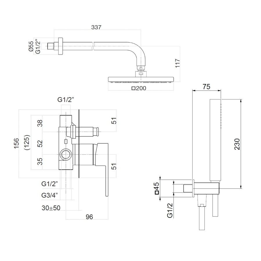 смеситель, внутренняя часть, верхний душ с кронштейном, душевая лейка, шланговое подключение, шланг